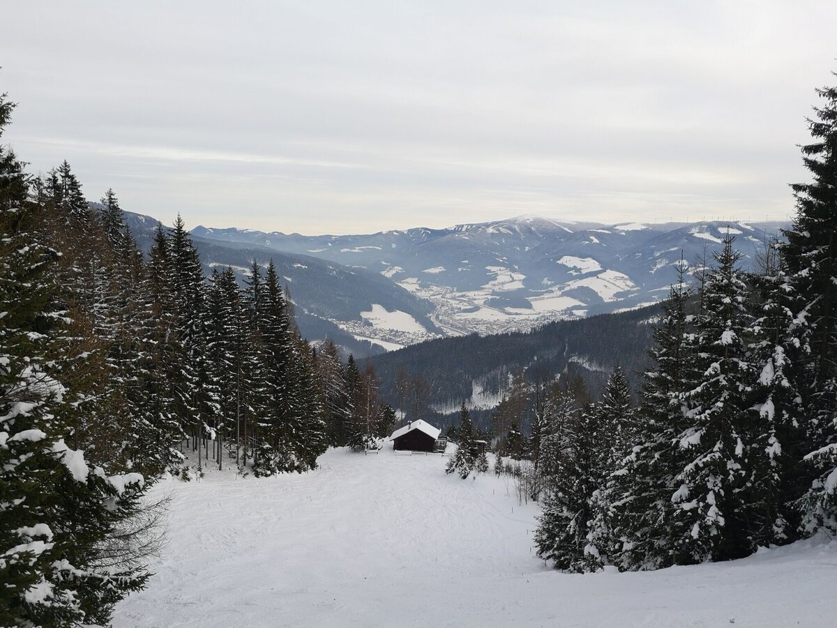 Zurück auf der Kaarlalm wandern wir nun immer bergab über eine alte Skipiste, vorbei an mehreren Gehöften, bis nach Mürzzuschlag. Dort geht es dann, natürlich nun mit abgeschnallten Schneeschuhen, zum Südbahnmuseum beim Bahnhof (Busbahnhof in der Nähe).