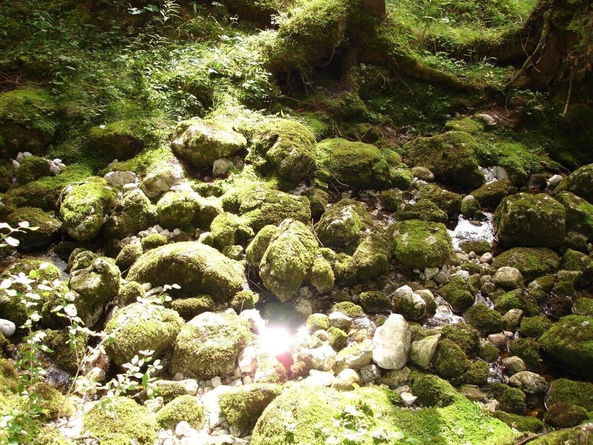 The hike starts just before the Stieger snack station at a small parking lot in the village of Mühlreith, the trail leads along the green signposts over a wooden footbridge and on through the picturesque forest terrain to the karst springs, which only carry water when there is high or melting water. In dry periods, they can be recognized by mossy stones in the riverbed.