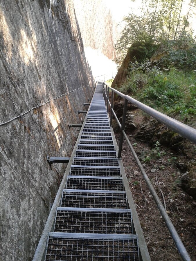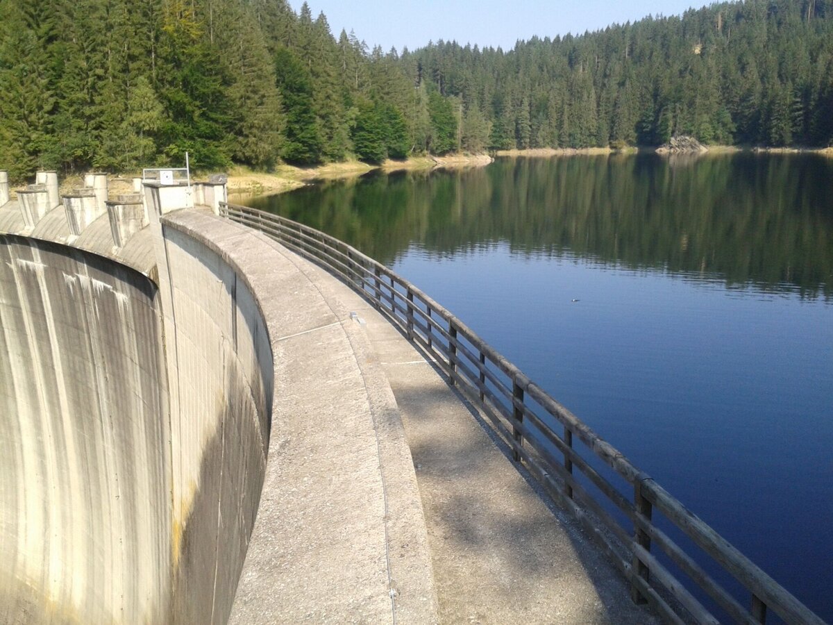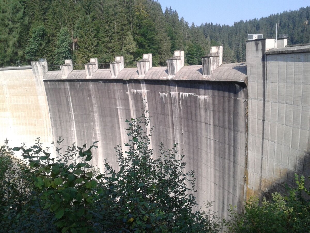 Nach weiteren 400 m erreichen wir das imposante Bauwerk sowie auch das Gewässer. Wir gehen den Weg an der rechten Seite der Staumauer vorbei, der Weg verläuft leicht bergauf und wir werden für ein kurzes Stück vom gemütlichen Rauschen des Wassers vom Stausee begleitet. Kurz darauf biegen wir wieder rechts ab.