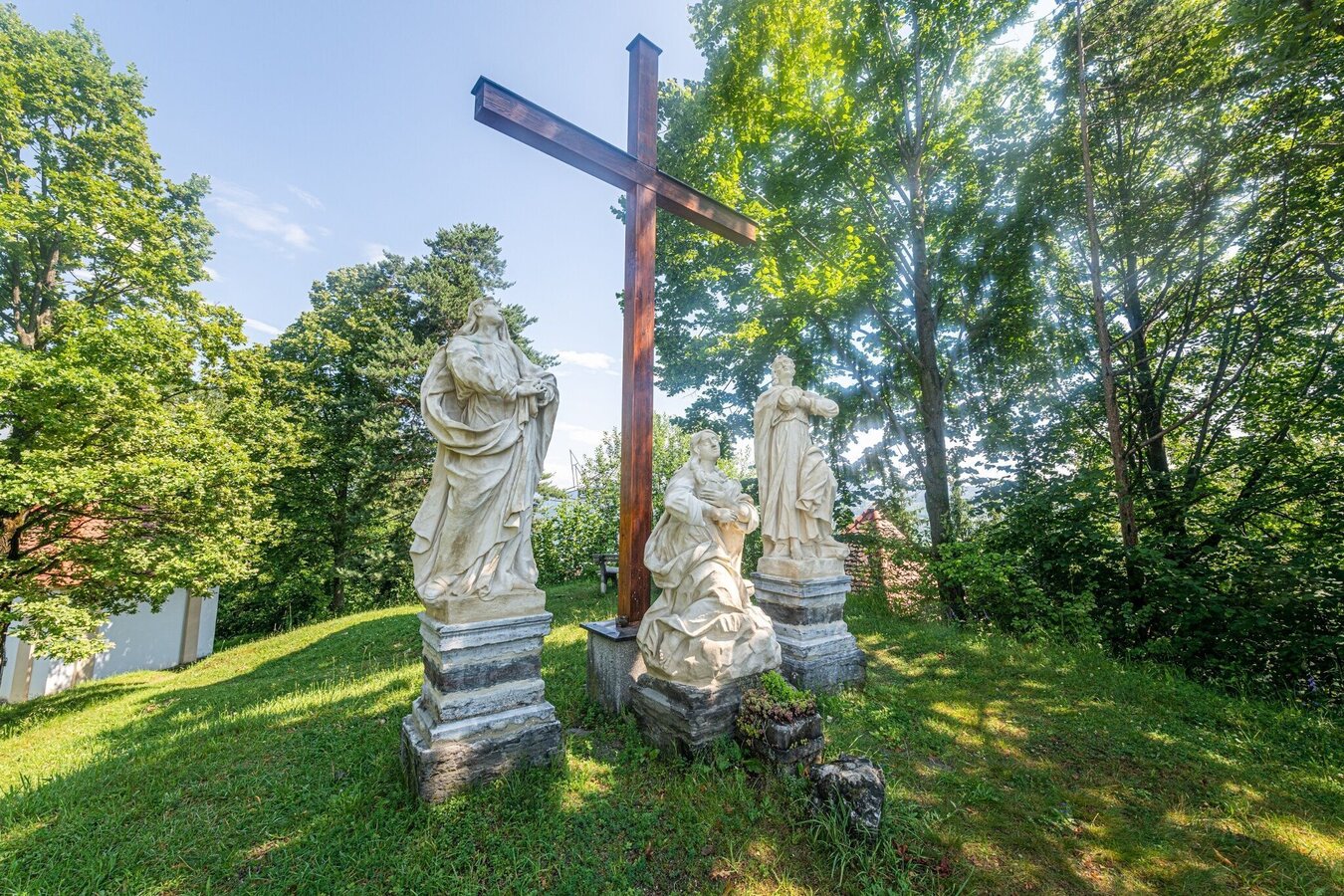 Von der Kreuzigungsgruppe aus blicken wir in südliche Richtung und sehen Voitsberg mit seiner Burg-Ruine zu unseren Füßen liegen. Begrenzt wird unser Blick durch das Aibl, einen Teil der Koralm. Westlich daran schließen die Hebalm, Packer-, Hirschegger- und Stubalpe an. Wir sehen das Gebiet Gößnitz, Maria Lankowitz, Köflach mit Piber, nördlich davon das obere Kainachtal, das den Blick bis zur Gleinalpe schweifen lässt. Gut sichtbar ist auch der Brendlstadl, ein Sommerhof des Lipizzanergestüt Piber. Östlich davon sehen wir den ehemals größten Braunkohletagebau Österreichs. Zu unseren Füßen liegt Bärnbach mit der weltberühmten Hundertwasser-Kirche, deren Goldkuppel im Sonnenlicht strahlt.