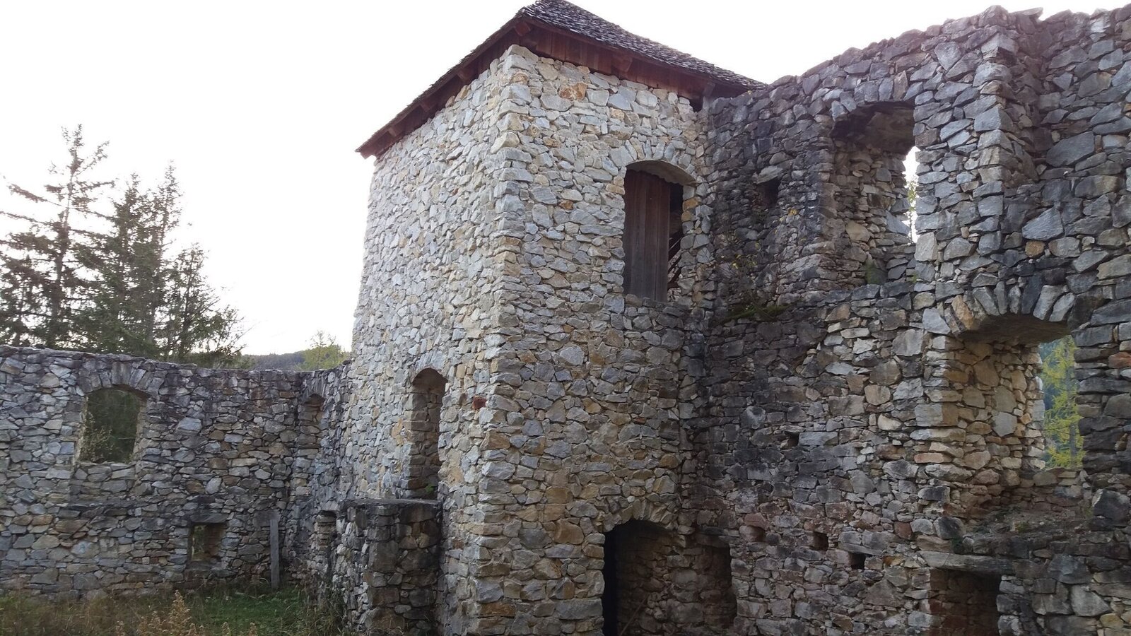 Dafür nehmen wir den bergaufführenden Weg zu unserer rechten Seite. Nach knapp 400 m erreichen wir die „Schlossreihe“, eine Kurve der Gaberl-Bundesstraße, hier halten wir uns links und gehen noch ein kurzes Stück, bis wir schließlich die Burgruine Klingenstein erreichen. Hier können wir in alte Zeiten eintauchen und das Relikt aus der vergangen Zeit bestaunen. Im Turm befindet sich auch ein Besucherbuch, wo wir uns eintragen können. Und eine Marien-Gedenk-Tafel lädt uns zum Innehalten ein.