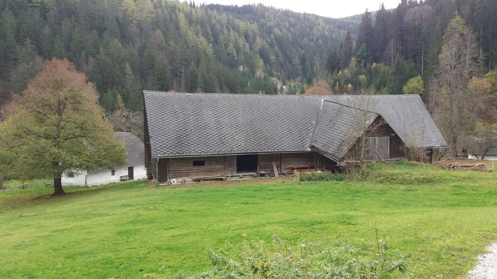Wir nehmen nun den ganz links liegenden Weg (ACHTUNG: Wir gehen nicht direkt am Haus vorbei) und folgen dem Weg durch einen dichten Wald. Nach und nach wird unser Weg zum Schotterweg, wir kommen zum Waldrand und sehen vor uns einen schönen alten Bauernhof vlg. Hofbauer. Wir wandern durch diesen Hof durch, kommen erneut zur Gaberl-Bundesstraße und biegen rechts auf den Steig, der parallel zur B77 verläuft, ab.