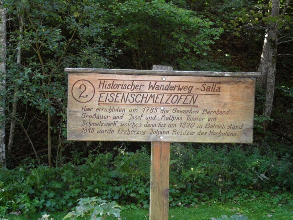 Der nächste Punkt des Weges ist der Eisen-Schmelzofen der Gewerken Tunner. 1783 erhielten Maria und Mathias Tunner sowie der Übelbacher Bernhard Großauer die Erlaubnis, einen "Eisensteinbergbau" und ein "Schmelzwerk zu errichten. 1785 wurde der Hochofen erbaut. Dieser Montanbesitz wurde 1848 von Erzherzog Johann gekauft. Mitten im Ort liegt das ehemalige Gewerkenhaus. Das Haus Salla Nr. 4 war der Sitz des "Hammer-, Eisenberg- und Schmölzgewerken zu Salla". Über dem Portal findet wir die Initialen "PT" für Peter Tunner. Er war der bedeutendste Eisenfachmann von Österreich-Ungarn. Im Erdgeschoss dieses Hauses befindet sich das Ortsmuseum, das gegen Voranmeldung jederzeit besichtigt werden kann.