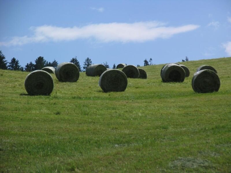Nach einer weiteren ¾ Stunde betreten wir eine große Wiese über welche der Weg zu unserem Ziel, dem Bauernhof Pölzl (Schutzhütte) führt. Bevor wir in das Haus eintreten um eine herzhafte Stärkung zu uns zu nehmen, machen wir einen Blick zurück. Das ganze untere Kainachtal liegt uns zu Füßen: Gleichenberger Kogel, Wildoner Berg, Buchkogel und Demmerkogel begrenzen den Horizont.