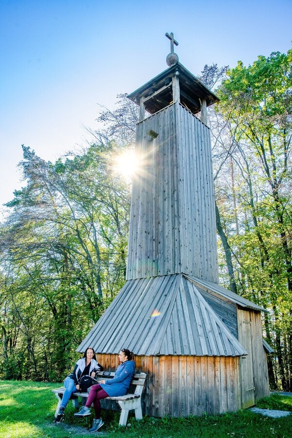 In the midst of the hilly landscape of the Schaftal, the trail leads past old apple trees and meadows and there is also a great view of Graz's local mountain Schöckl. A special attraction on the trail is the Schaftalberg weather tower. This is a bell tower made of spruce wood which was rung in case of danger from storms or fire. Right next to the tower, a shady chestnut tree invites you to have a picnic. A stop at the Griesbauer Inn, which is famous for its fried chicken, is also highly recommended. Here you can linger under the shady chestnut trees. And children will also enjoy themselves at the adjacent playground.