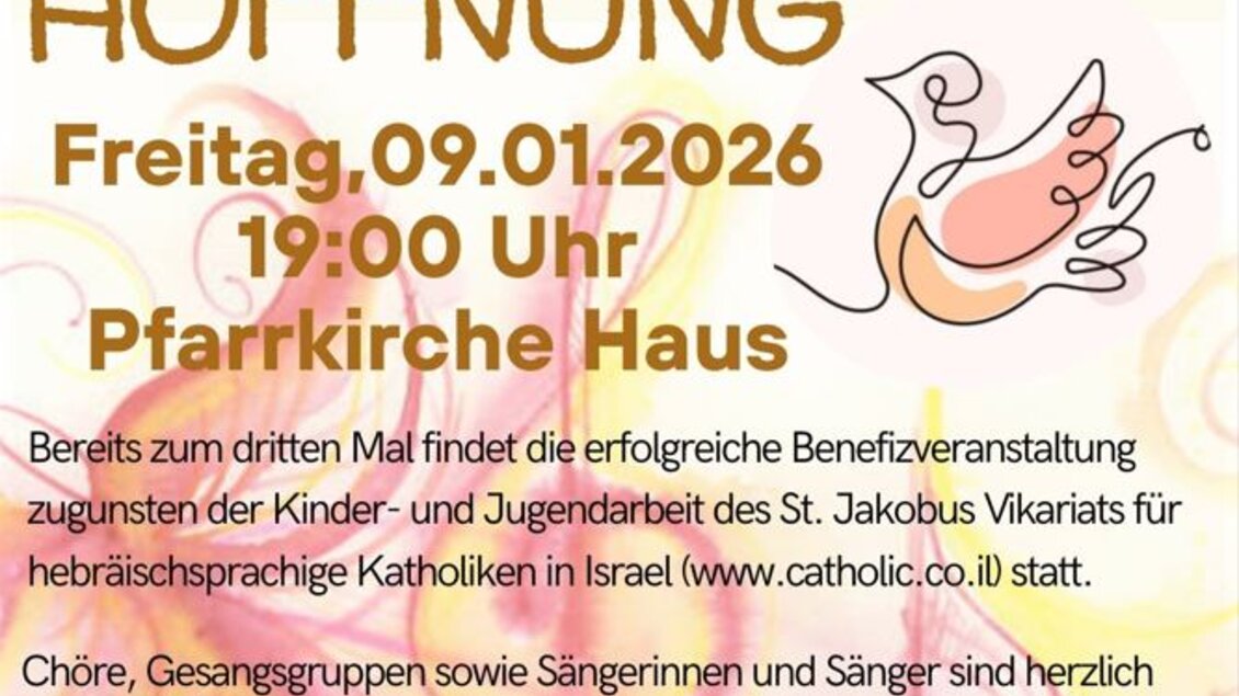 You are cordially invited to the Song Evening of Hope on Friday, 9 January 2026, at 7 p.m. in the parish church in Haus im Ennstal.