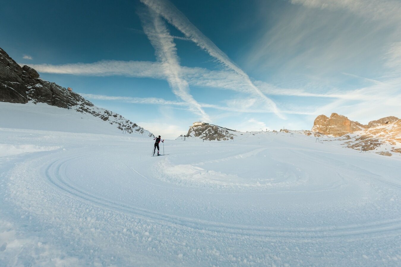The Ramsau trail is the shorter of the two high-alpine glacier trails on the Dachstein Glacier and offers you glacier cross-country skiing with a great view towards Grimming and the Krippenstein.