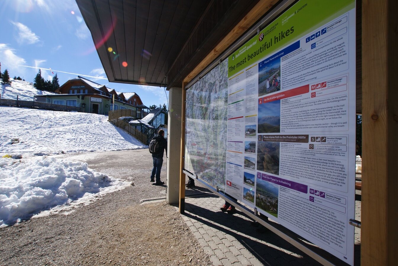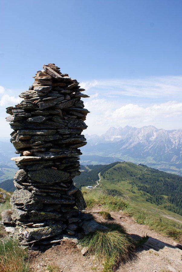 If you are willing to walk downhill for another 2 to 2.5 hours and 1,100 meters in elevation you can also descend via one of several trails (numbers 50, 53, 55, 779) to Schladming.