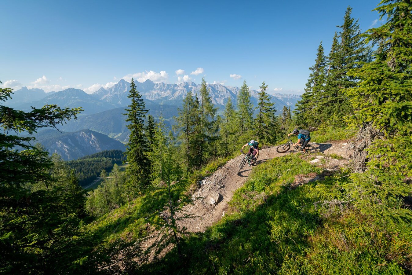 Once you arrive at the Gasselhöhebahn mountain station, an impressive panoramic view of the Enns Valley and the Dachstein awaits. The upper part of the trail winds its way through sparse forest with plenty of variety and curves. After a long traverse between the top panorama and rock faces, you reach a short section of piste, which you leave again after approx. 150 m in the direction of the forest. The second section of the trail is rather quicker and more playful and ends directly at the end of the Holzer Trail just above the Eiskarhütte. After a short section on the Holzer Trail, you continue on the Eiskar Trail.