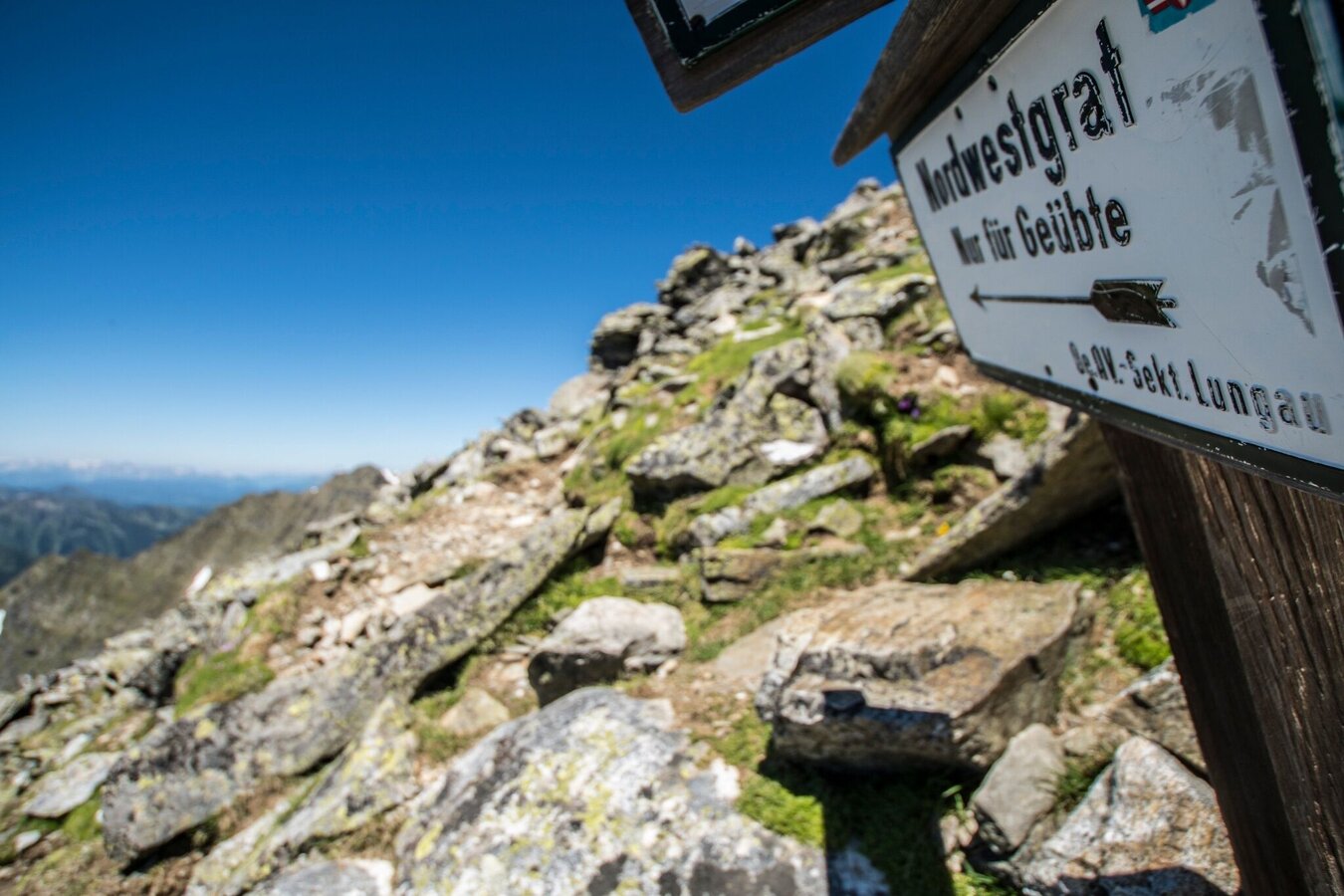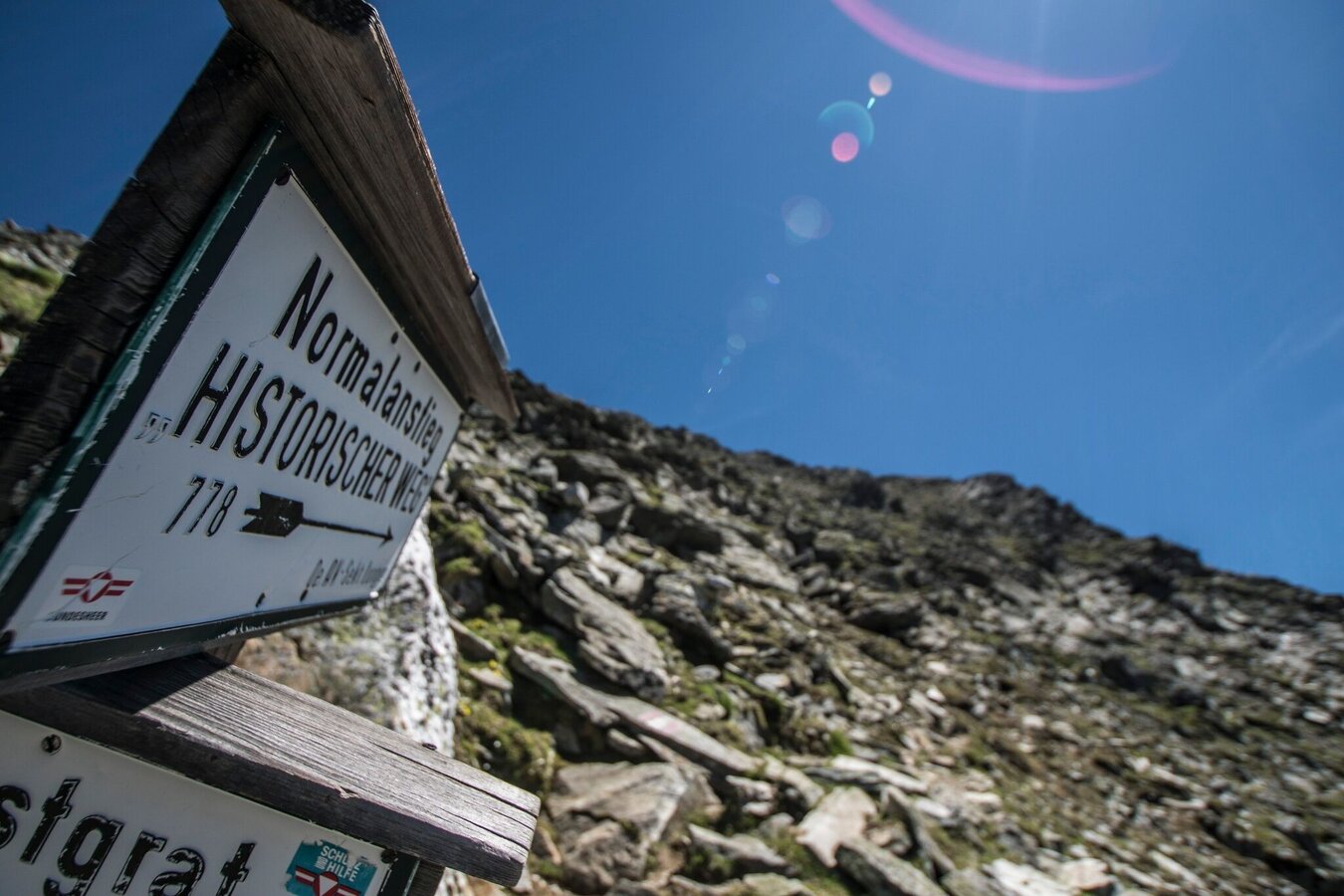 From Gollingscharte you keep left and ascend further to the summit via several rock shoulders and gruff gorges along the West face. In the last third of the ascent the difficult ascent via the West ridge turns off from the standard trail (historic route). The West ridge offers a couple of easy climbing sections.