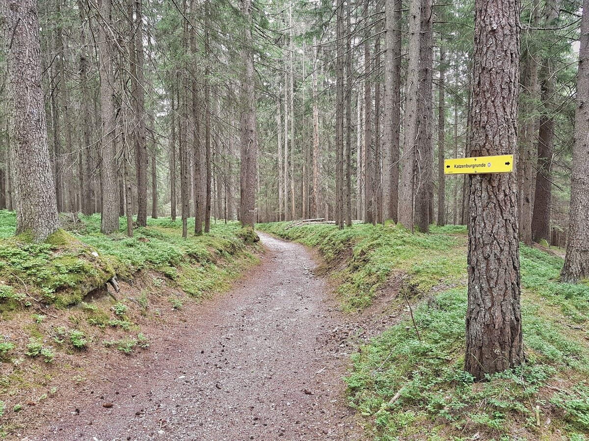 At the end of Waldstraße road (at the barrier) you make a right and follow trail n° 13. This trail ascends fairly steep to the plateau of Ramsau and crosses Ramsauerstraße two times. Near pension "Adlerhorst" you reach flatter terrain again. You pass by the pension and follow Buchenweg road just before Reiterhof farm. The trail to the remains of castle Katzenburg turns off at the end of the paved road. From the ruins (only a few walls remain today) you take the same way back to Buchenweg road and make a right there. You follow the trail for about 30 minutes until you reach the turn-off to Schladming.