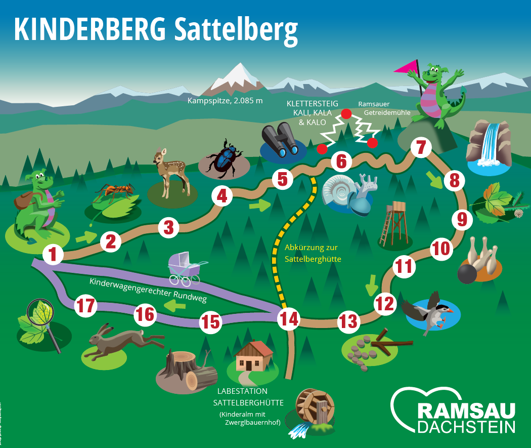From the car park in Obere Leiten, head east, past the Mountain Hostel and the Pension Concordia to the starting point of the environmental and nature trail, where Kali the Ramsaurier greets you in all his grandeur. Now continue hiking east downhill through the forest, where the part of the circular trail suitable for strollers takes you past a few stations to the Sattelberghütte. You return on the same path or along another loop suitable for strollers.