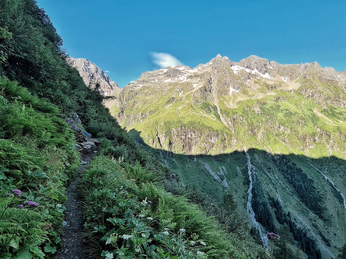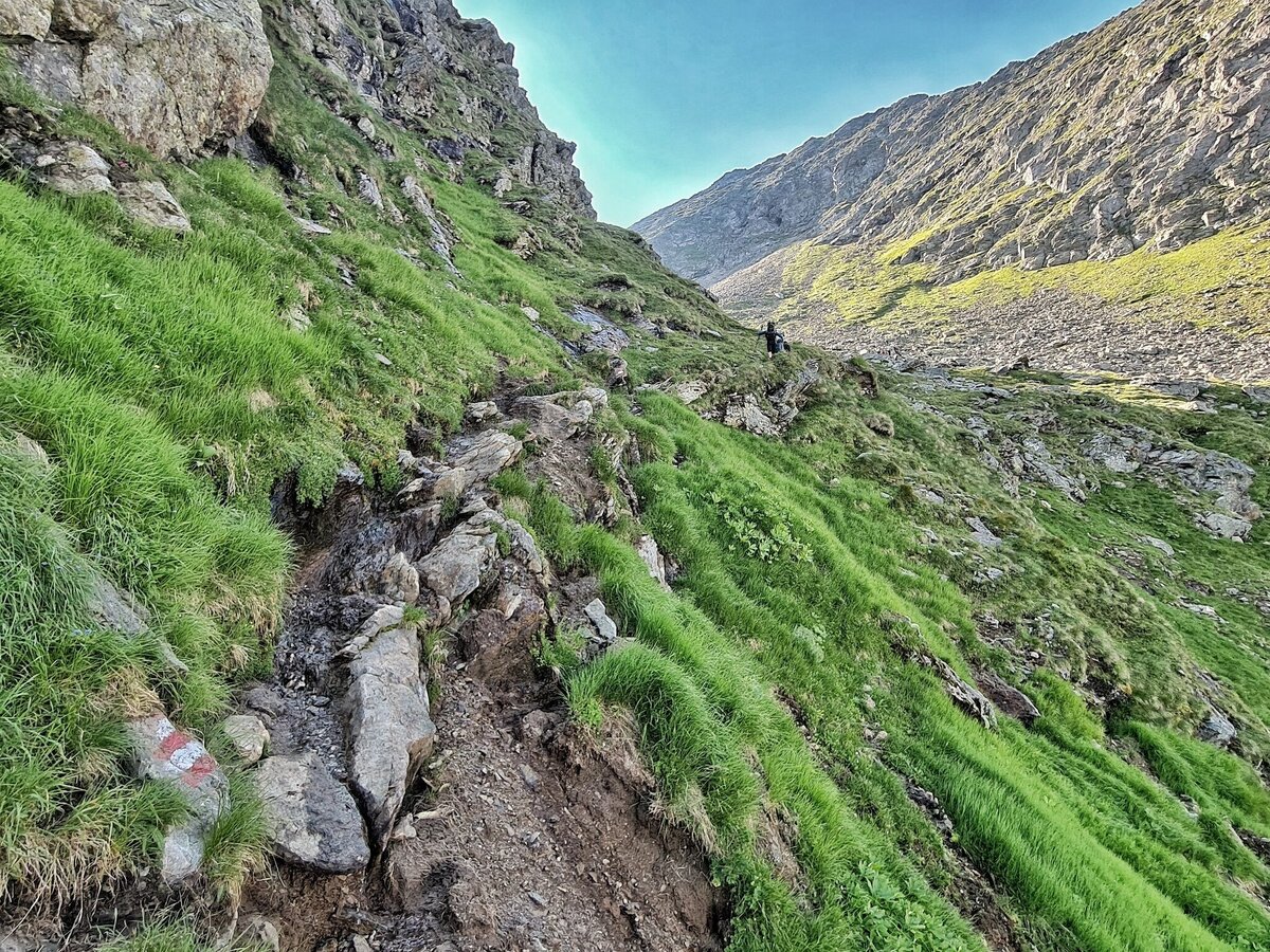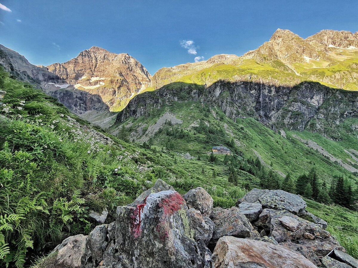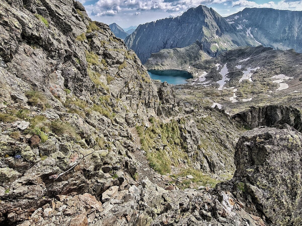 The further climb to the Greifenberg Mountain (2,618 m) is via a stepped scree. Towering above all, and framing the Klafferkessel, rise the flanks of the Waldhorn opposite and before them, in the green of the mosses, shine the scenic mountain lakes, large and small, scattered over various levels. Further East the pyramid of Hochwildstelle rises into the sky - below the green slopes of "Himmelreich" (Kingdom of Heaven). From the summit you walk, initially across crumbly land (Trail No. 702 – short stretch of safety ropes) on sharp hairpin bends downhill into the corrie.