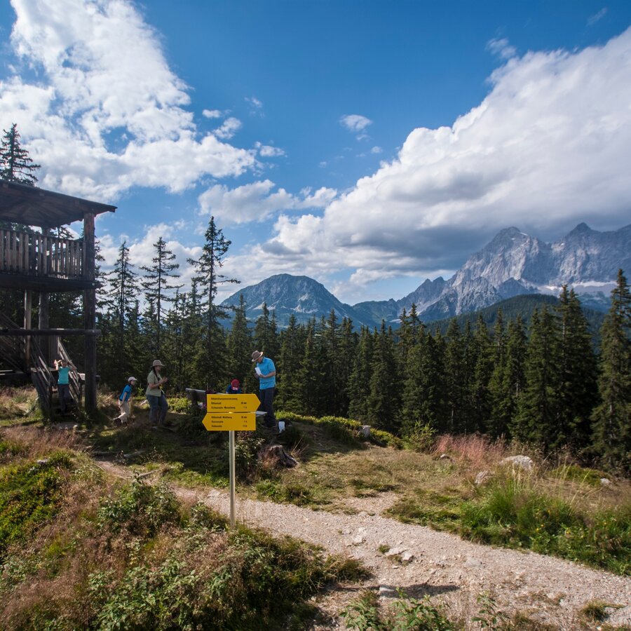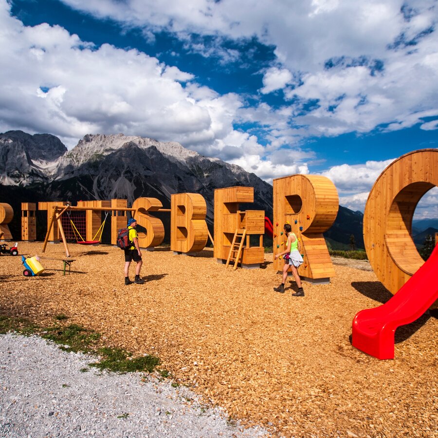 From the Sonnenalm you now follow the signage towards "Rittisberg Gipfelkreuz" - the summit of Rittisberg. At first you continue via a forest road and then you can choose between a beautiful forest trail or the forest road (suitable for prams) as you ascend through the mountain forest to the summit. Again and again you are rewarded with panoramic views to the Schladminger Tauern mountains and Reiteralm. At the mighty cross on the summit of Rittisberg you then enjoy the stunning view to the South face of the Dachstein.