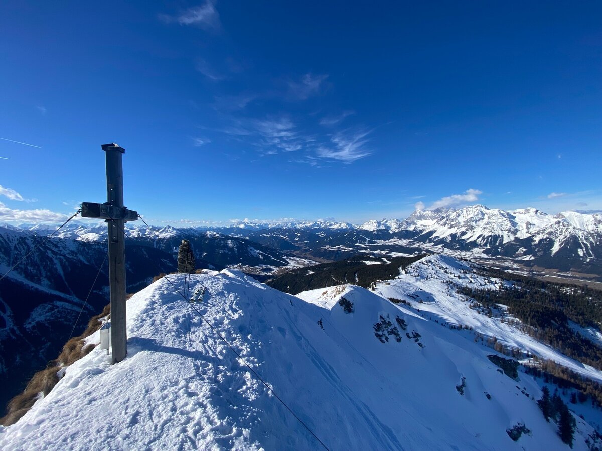 This short skitour to Krahbergzinken starts near the top of Mitterhaus chairlift. The starting point can be reached via Planai cable-car, Märchenwiesen chairlift and Mitterhaus chairlift on marked terrain. At Krahbergsattel, south of the top of Mitterhaus chairlift, you leave marked terrain and head into the sparse wood at the timberline, which you soon leave behind. You ascend along the Northwest face, which gets a bit steeper towards the end. Shortly before arriving on the summit you unstrap your skis to reach the summit on foot. The East face is falling off steep here - be very careful!