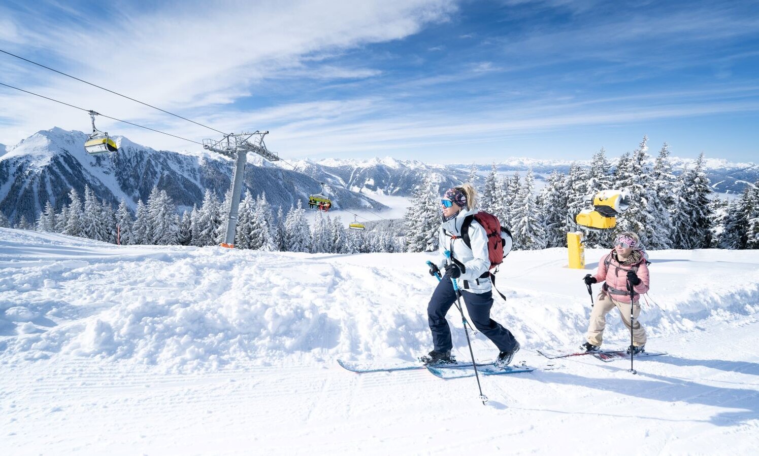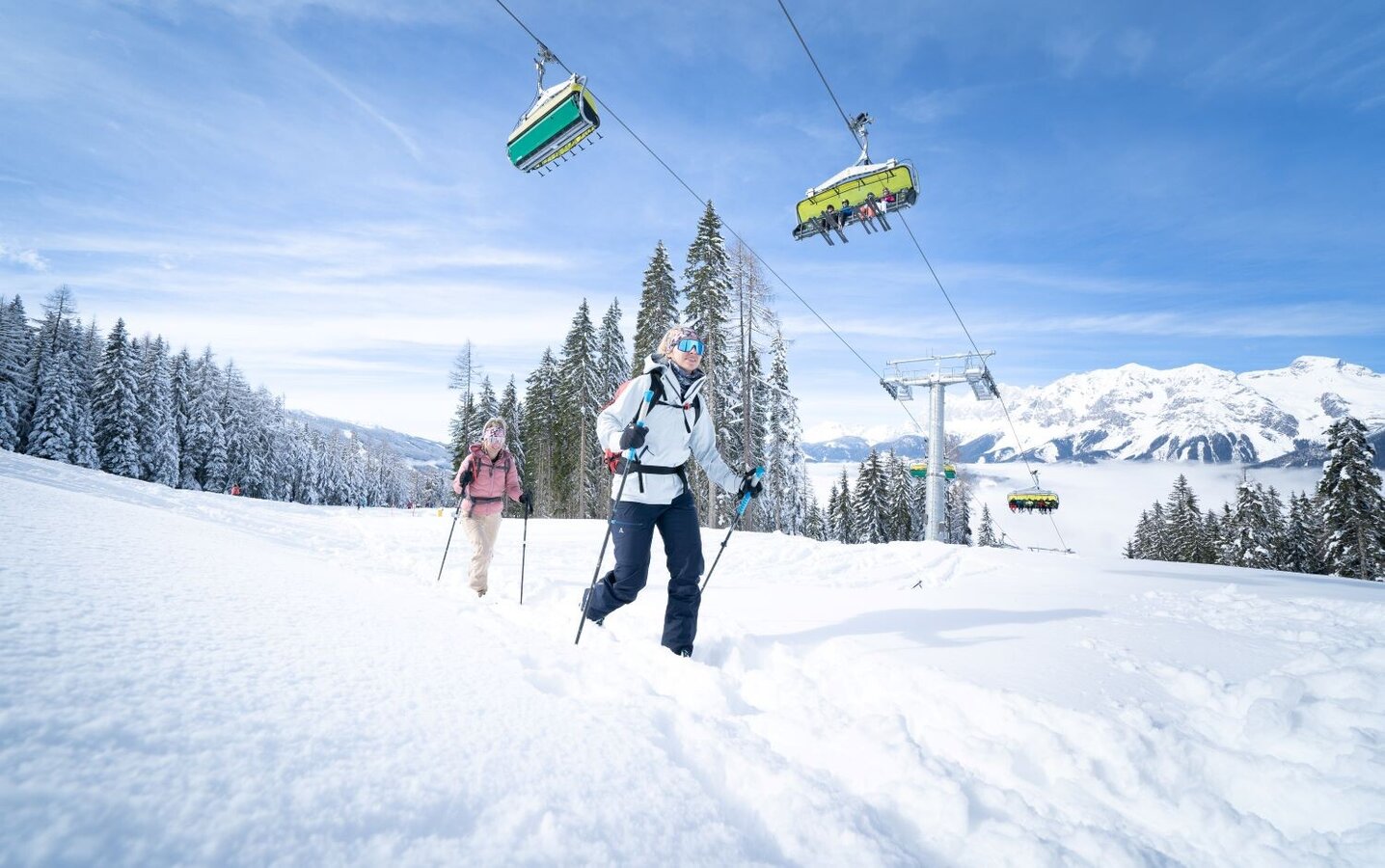 The ascent track on the Planai starts at the Planai middle station or Lärchkogel valley station and leads in the first section via the WM path up to the Lärchkogel. The trail then continues to the Planai summit at 1.906 m. As the ascent track largely leads through the forest, attention must be paid to the snow conditions off the piste. The ticket must be purchased in advance at the ticket office at the Lärchkogel valley station. Please note that the ski tour is only possible during the opening hours of the pistes. Subject to charge - ticket required! You can find the ticket prices here: www.planai.at/en/tickets-and-prices/winter-prices