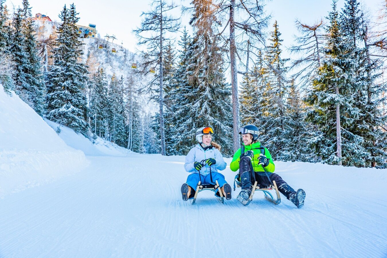 The toboggan run starts at Hochwurzenhütte chalet and runs down along the Hochwurzenstraße road (in winter closed for the toboggan run) to the valley terminal of the Gipfelbahn Hochwurzen cable-car.