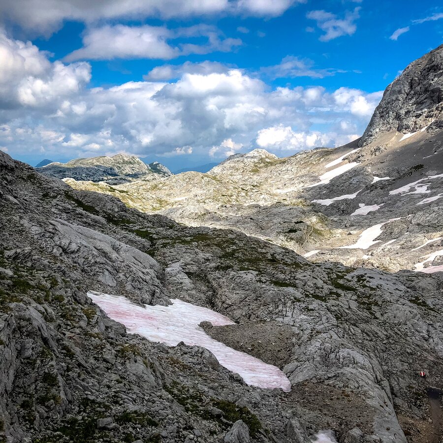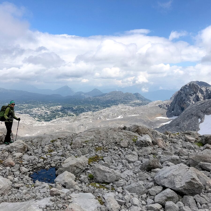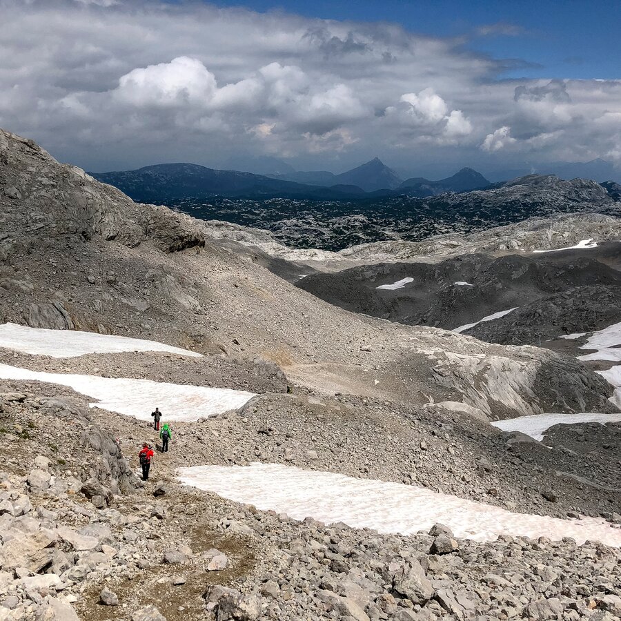 Follow the path to Guttenberghaus, towards Gjaidstein and stay to the left of the drag lift. You can use the snow poles, the coloured marking on the rocks and, the cairns for your orientation. To your right are the steep rock walls of the Koppenkarstein, to your left the Gjaidstein and far back on the horizon lies the gorgeous mountain range of the Totes Gebirge and the Grimming.