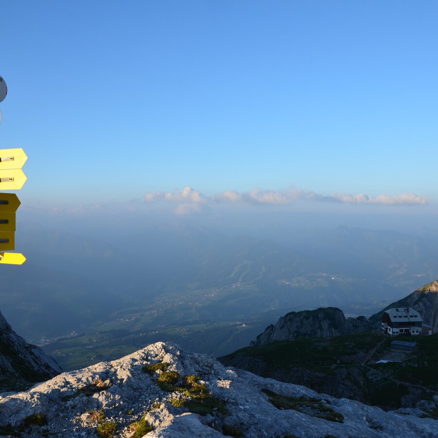 Passing the summit of the Landfriedstein and Eselstein, you will reach the Feistererscharte, where 2 paths will cross. Path no. 616 leads across high-alpine terrain Am Stein to the Krippenstein in the north of Dachstein’s plateau and, the path no. 616 to the already visible Guttenberghaus (Tel. +43 664 3022956) with its alpine pastures and meadows, 1000 m below the hut. You can look forward to good Styrian cuisine and beautiful views of the Schladminger Tauern.