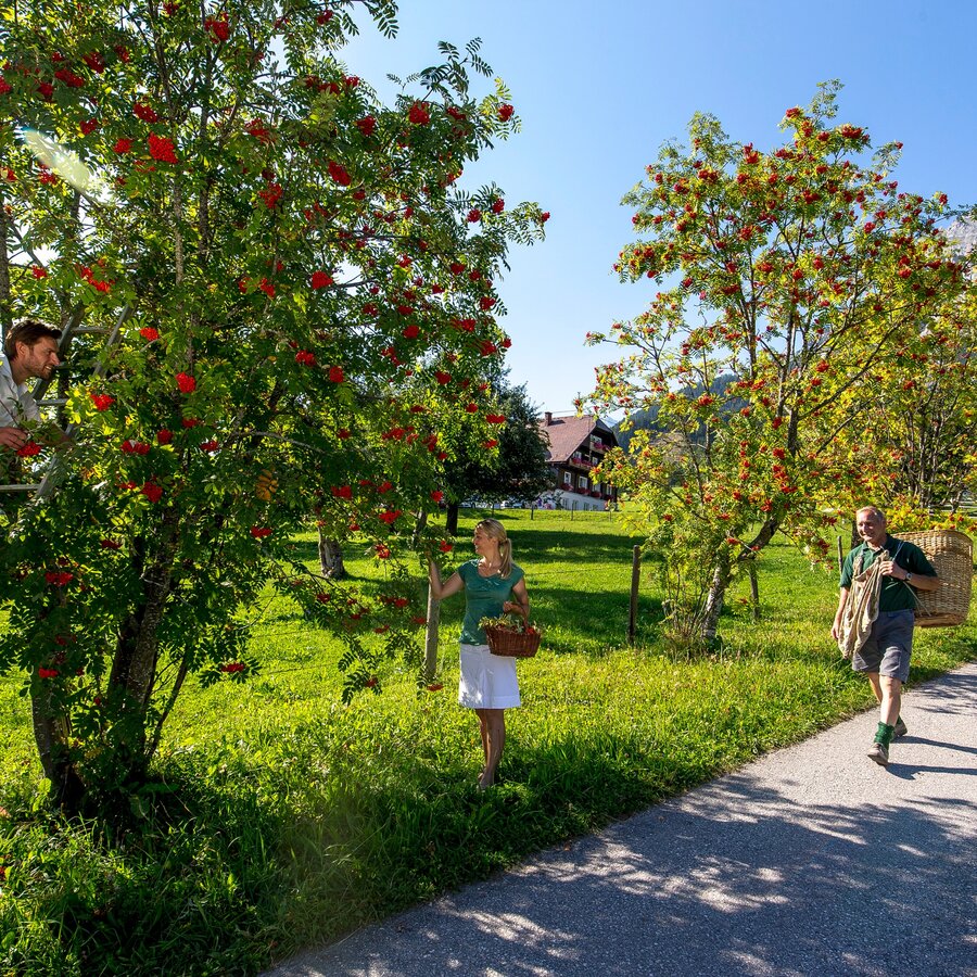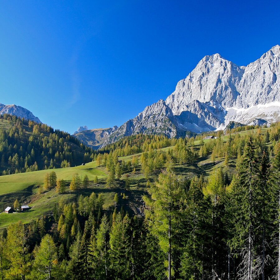 At the beginning of this stage on the hiking route "From Glacier to Wine", we take trail number 616, which leads steeply downhill via the idyllically situated Lärchbodenalm (Tel. +43 3687 81743) to the high plateau of Ramsau am Dachstein. We are accompanied on this descent by the beautiful view down to the plateau as well as to the opposite Schladminger Tauern, which await us on our next stages. Arrived at the plateau, we keep to the right after the Hotel Feistererhof to cross meadows and past beautifully situated houses and farms to the Eiskarlift, a small drag lift. Here the hiking trail makes a turn to the left to lead us directly into the center of Ramsau am Dachstein.