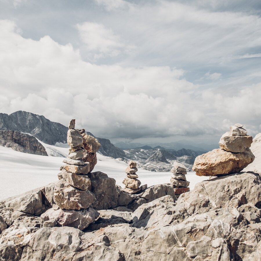 Glacier hike over the Schladming Glacier and the "am Stein" plateau to the Guttenberghaus with a walking time of around 4 to 5 hours. Most of the meters uphill are overcome with the help of the Dachstein Gletscherbahn. In contrast to the green Ramsau alpine pasture area at the foot of the Dachstein south walls, the karst plateau "Am Stein" looks almost like a lunar landscape. Experience this special landscape, which is also a UNESCO World Heritage Site.