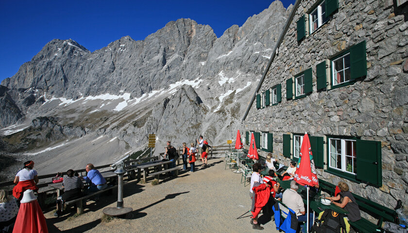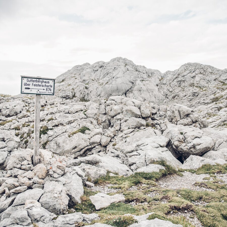 The landscape is typical of the "am Stein" plateau, snow hollows, easy climbs, rocky ridges and a wide view of the Totes Gebirge Mountains form the scenery. After about 4 hours of walking, 2 climbs meet on the Feistererscharte. Path #616 is the descent to the already visible Guttenberghaus at 2,146m above sea level. The highest mountain shelter in Styria is the 2nd stage destination on the Dachstein circular hiking trail.