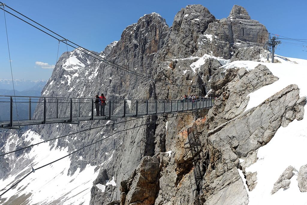 The descent from the Südwandhütte is best done early in the morning and takes about 35 minutes to the valley station of the Dachstein Gletscherbahn. The cable car overcomes 1000 meters in altitude in just 7 minutes to the Hunerkogel mountain station. The "Sky Walk" viewing platform, the Dachstein Ice Palace and the suspension bridge with the stairway to nothingness are located right next to the mountain station. Definitely worth a visit.