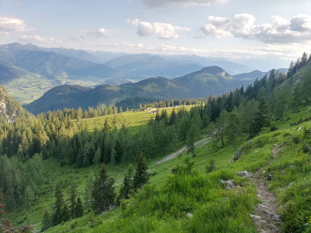 You start from the parking lot Schönmoos hike, following the signs, along the forest road to the embedded Bärenfeichtenalm. The view is magnificent! Both Wölzer and Schladminger Tauern as well as the Grimming lie before you. On the other side, the Hochtausing - affectionately called "Ennstaler Zuckerhut" - rises up. To go around it you continue to the Schneehitzalm and then a little steeper downhill to the Langpoltner Klamml. At the entrance of the via ferrata you pass and go back to Schönmoos via forest and forest road.