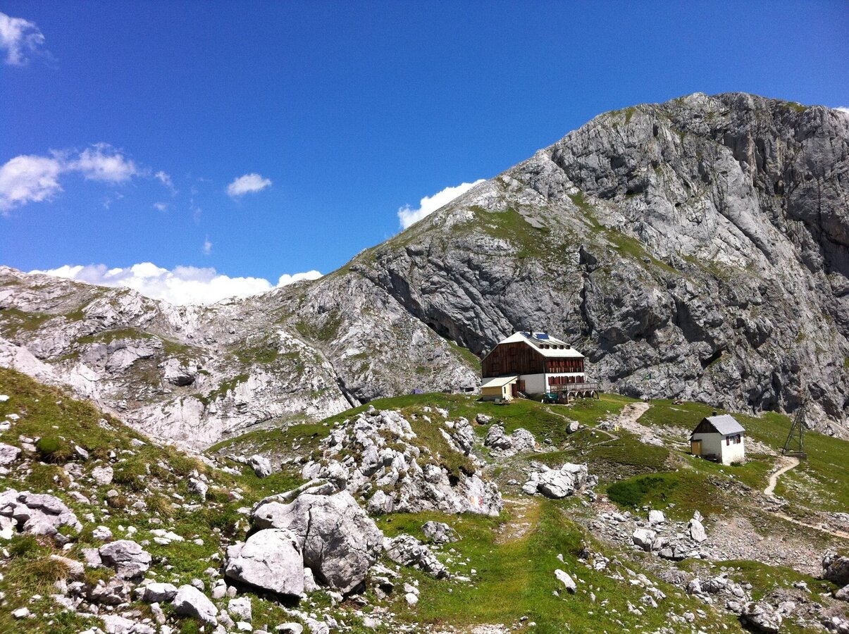 The hut was built in 1914 and is nestled between the rocky peaks of the Scheichenspitze and the Sinabell, on a green hill in front of it. Beautiful vantage point and important hiking hub! On the one hand there is the path to the Dachstein glacier, the crossing of the karstified high plateau in a northerly direction to the Krippenstein or the ascent to the Scheichenspitze and the Ramsau via ferrata. From here you move in high alpine terrain - appropriate behavior is a prerequisite for safe hiking. The local mountain of the Guttenberghaus is the Sinabell. The ascent to the summit takes a good hour and is also used as a descent option from the Austria via ferrata Sinabell.