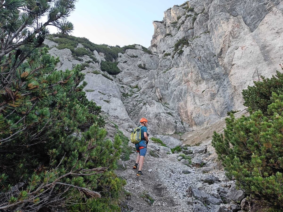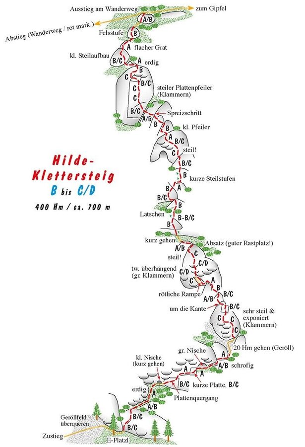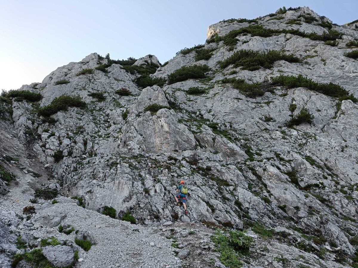 25 min. from the car park to the Rosemialm and continue eastwards to hiking trail no. 675. Turn right downhill to the toll road, after the bend turn left on the red marked hiking trail steeply downhill to a small hut below a climbing garden. Take the wide gravel path on the left for approx. 200 metres uphill to the junction "Zustiegssteiglein Hilde-Klettersteig". Finally, cross a scree field to a rock face and descend along it briefly to the entry point (large tree).