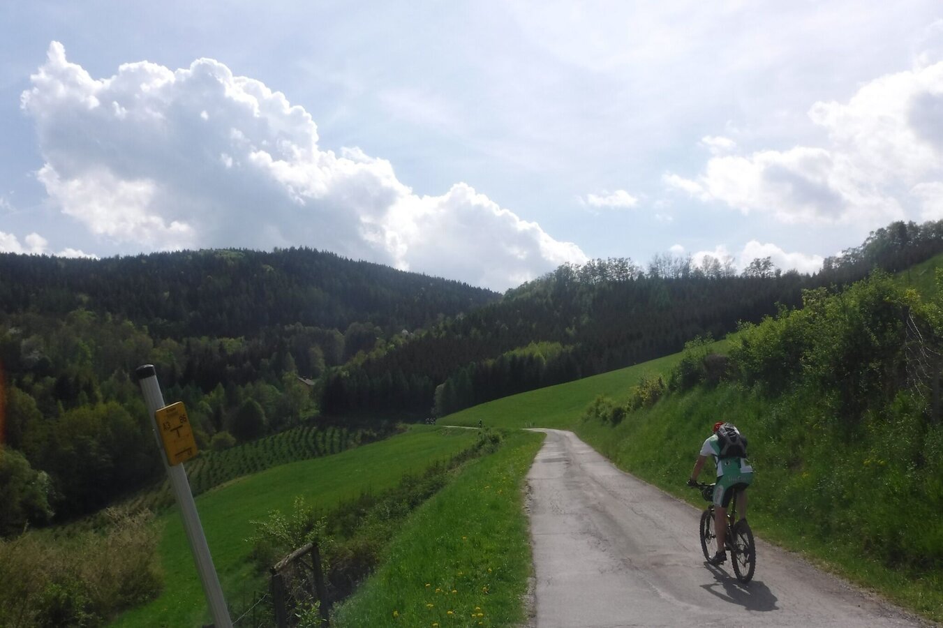 The second option takes us to the Leingraben junction in the direction of the quarry, and we turn left at the first junction, either via the Rappold estate or via Reisser. From Wegscheide in the direction of Arndorf, you can also cycle to the Jörgl am Eck viewpoint.