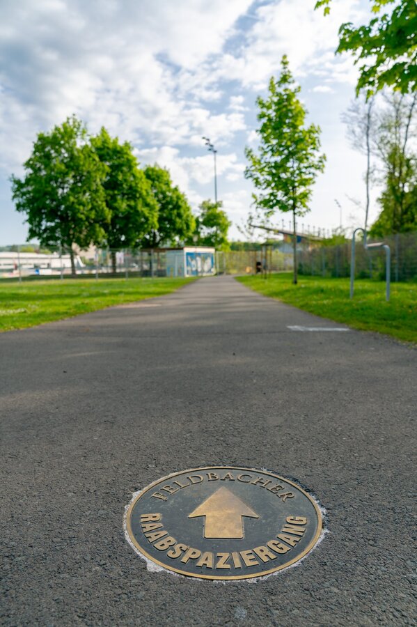 The path leads to Feldbach Stadium (3) – featuring a grandstand, running track, and sports facilities.