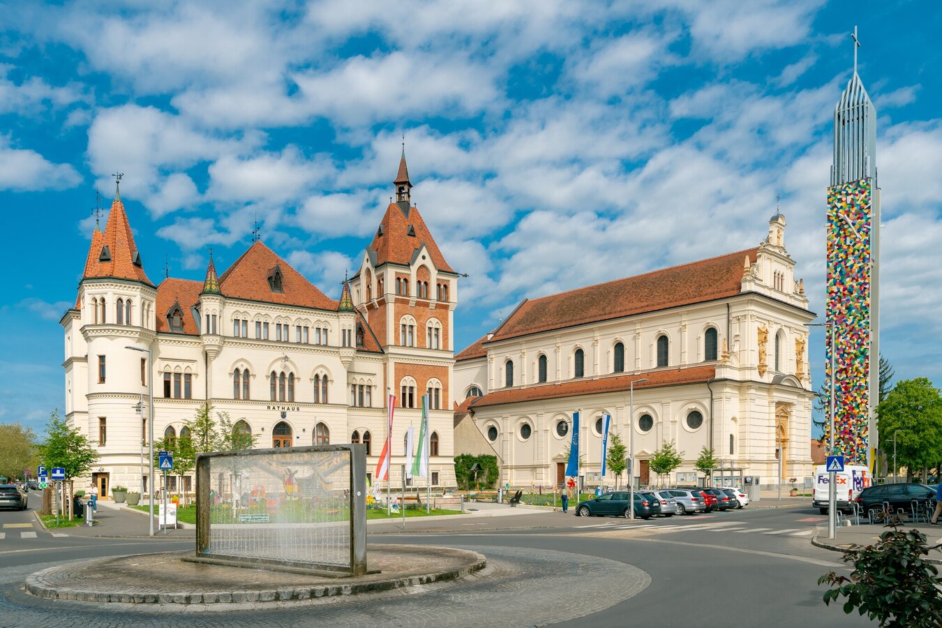 Start at the colorful church tower – the vibrant landmark in the Rathausviertel, surrounded by the parish church and fish fountain.