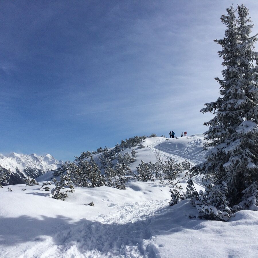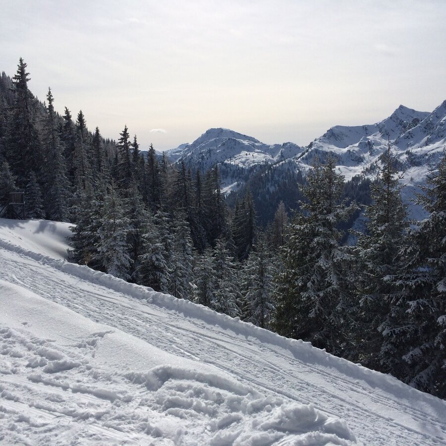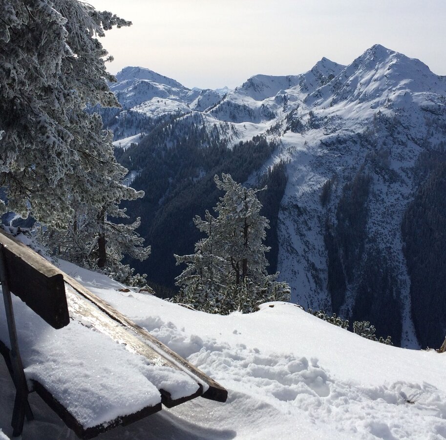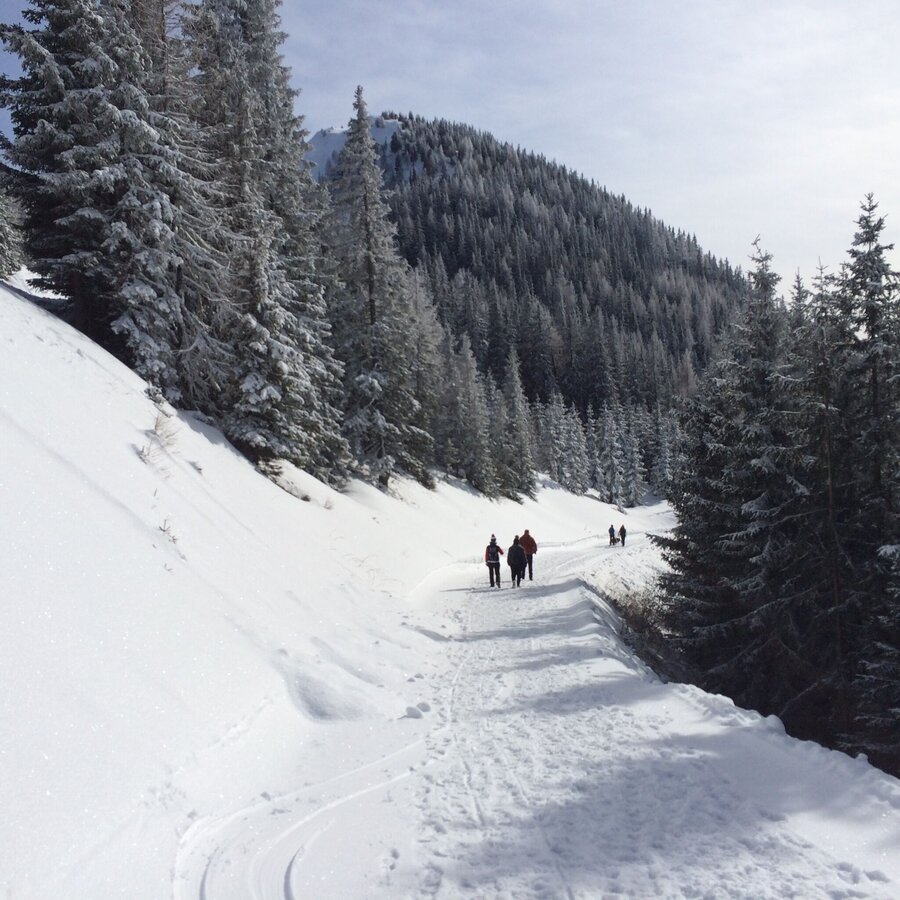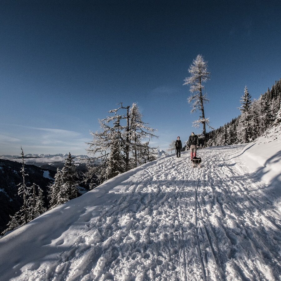 Wide, groomed winter walking trail through the forest to the summit of Hochwurzen (1,852 m). You can either walk uphill to the mountain terminal of the Gipfelbahn Hochwurzen cable-car or take the cable-car and walk downhill.