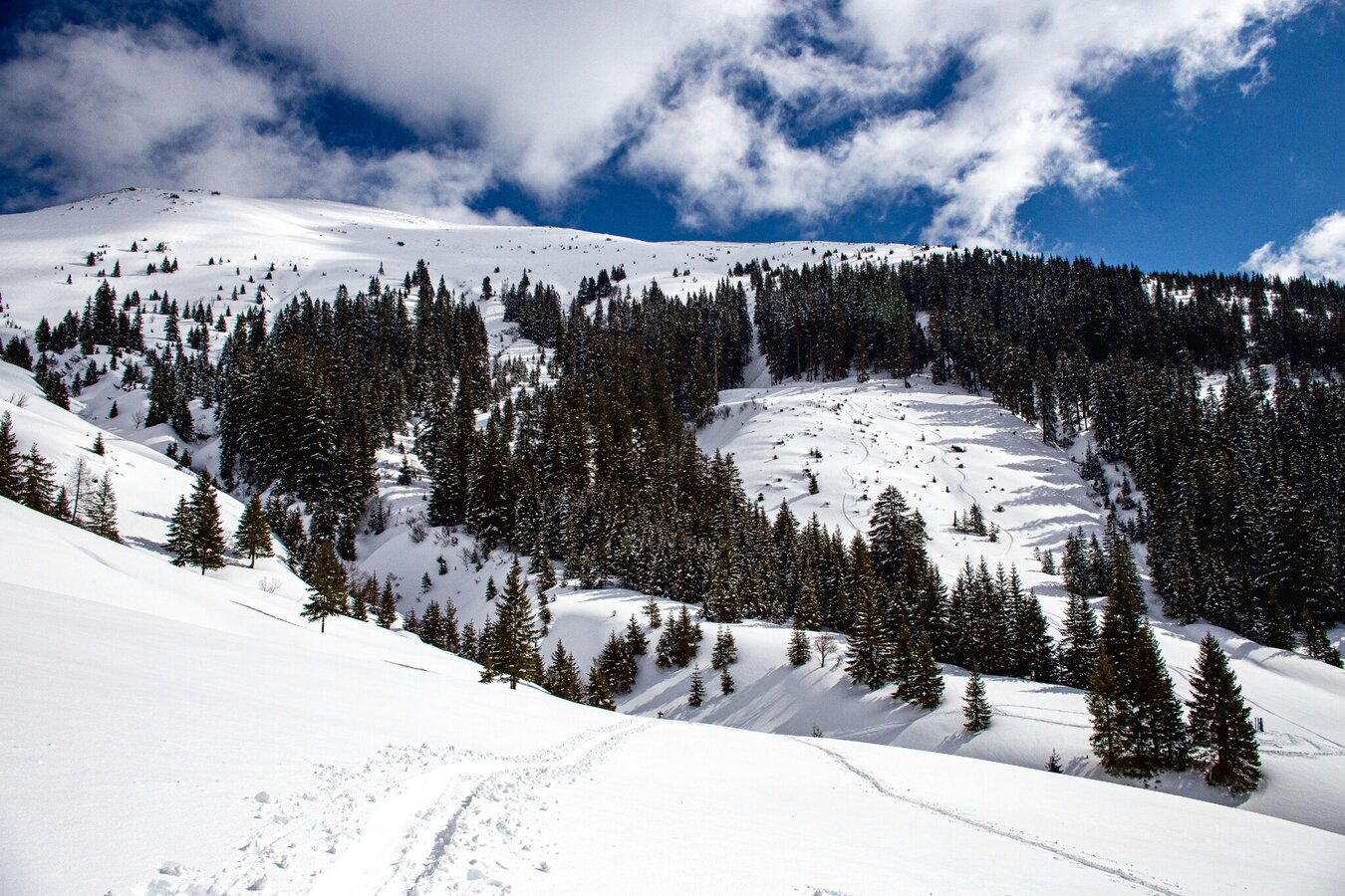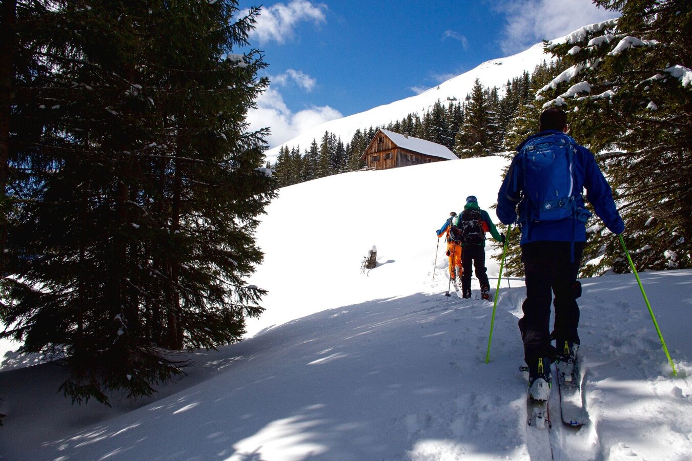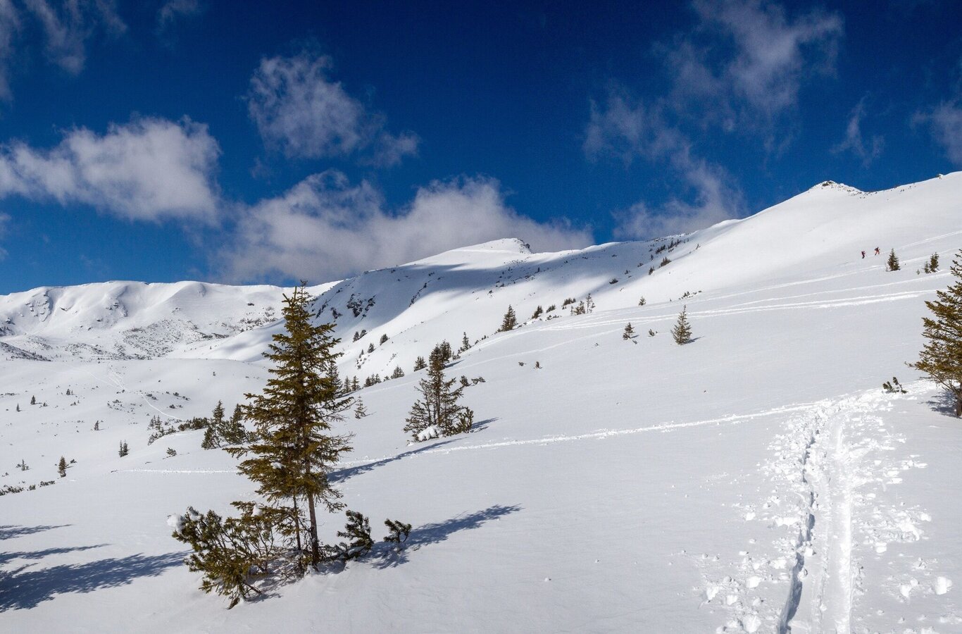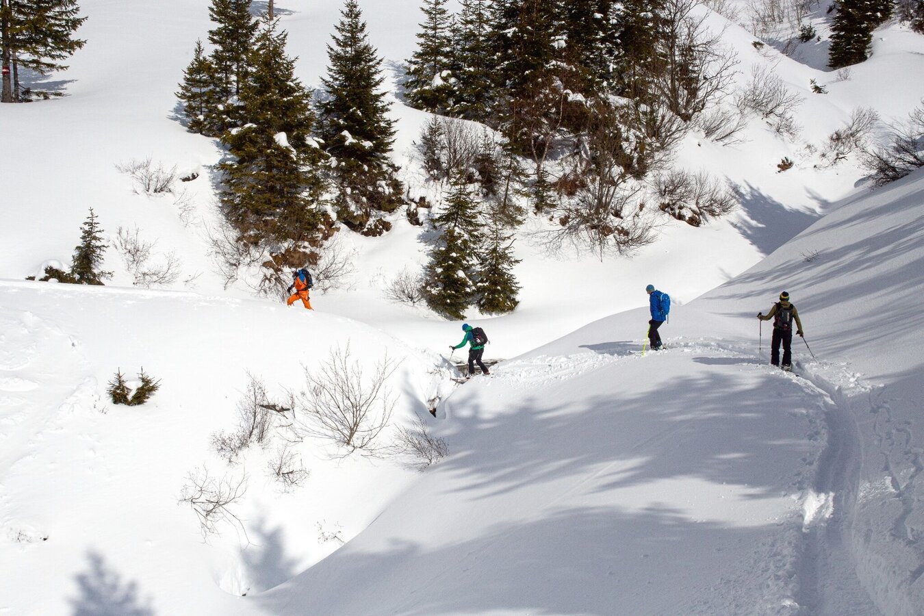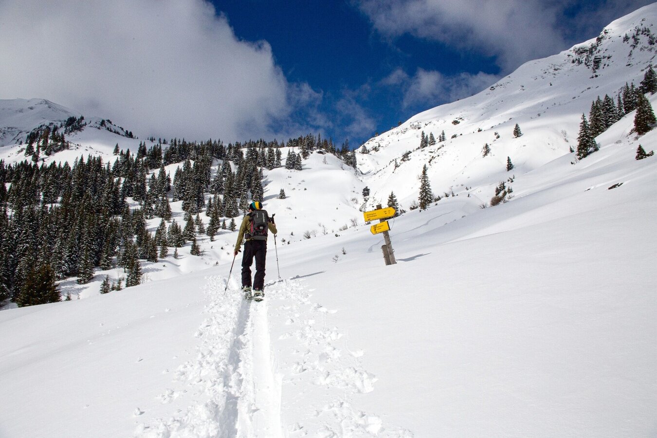 Either you take the Gläserboden lift to the mountain ridge of the same name or you walk up next to the ski slope. From the mountain station eastwards to a small saddle, from where you descend steeply to the Plientensattel. You can skin up here and ascend over the ridge to the summit or head southeast into a hollow and from there ascend over the slope to the south and just before the ridge head west to the Hintergullingspitz. The descent is over wonderful slopes directly west to the Stallaalm. There you climb up again and cross the Goldbach a bit north of the Stallaalm and climb up following the summer path to the Goldbachalm. Taking advantage of the open terrain, you cross to the northwest up to about 1760 meters. The Goldbachscharte is easily recognizable. Below the Goldbachscharte you ascend keeping to the right in several hairpin bends to the Scharte.
