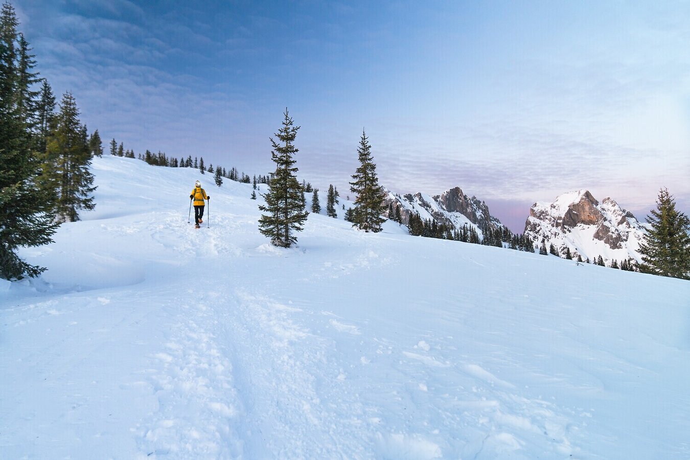 We start our tour at the parking lot of the family ski area on the Kaiserau. The ascent runs parallel to the family run at the Brunntallift. At the fork, we follow the signs to the right and continue to a small stream, where there is a sign saying “Skitour.” We then climb through the forest via the Wagenbänkalmen to the summit of the Lahngangkogel. We continue towards the Klinkehütte, which is closed in winter. The descent from the Klinkehütte is either via the steep slope or via the forest road, which is not cleared in winter, back to Kaiserau, where we stop for refreshments at the Sportalm.