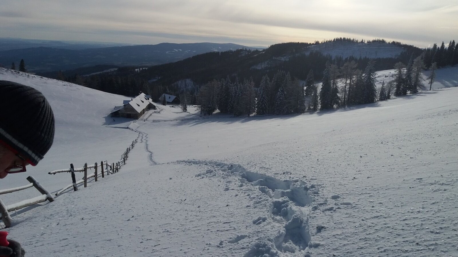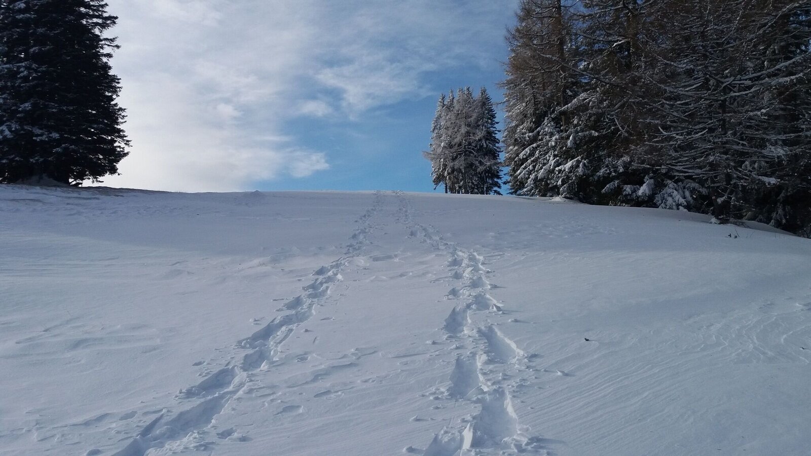 Wir stapfen in Richtung dieser Gebäude und wandern leicht bergab weiter. Links von den Gebäuden sehen wir einen Teil des „sommerlangen Zaunes“, der nun unser Richtungsweiser und Begleiter ist. Wir gehen parallel zu diesem bergauf bis wir das obere Ende erreichen. Der Wegverlauf ist mäßig bergauf, zwischendurch sollten wir eine kurze Rast machen und die Aussicht genießen.