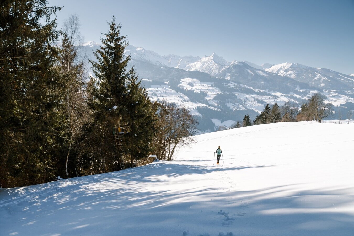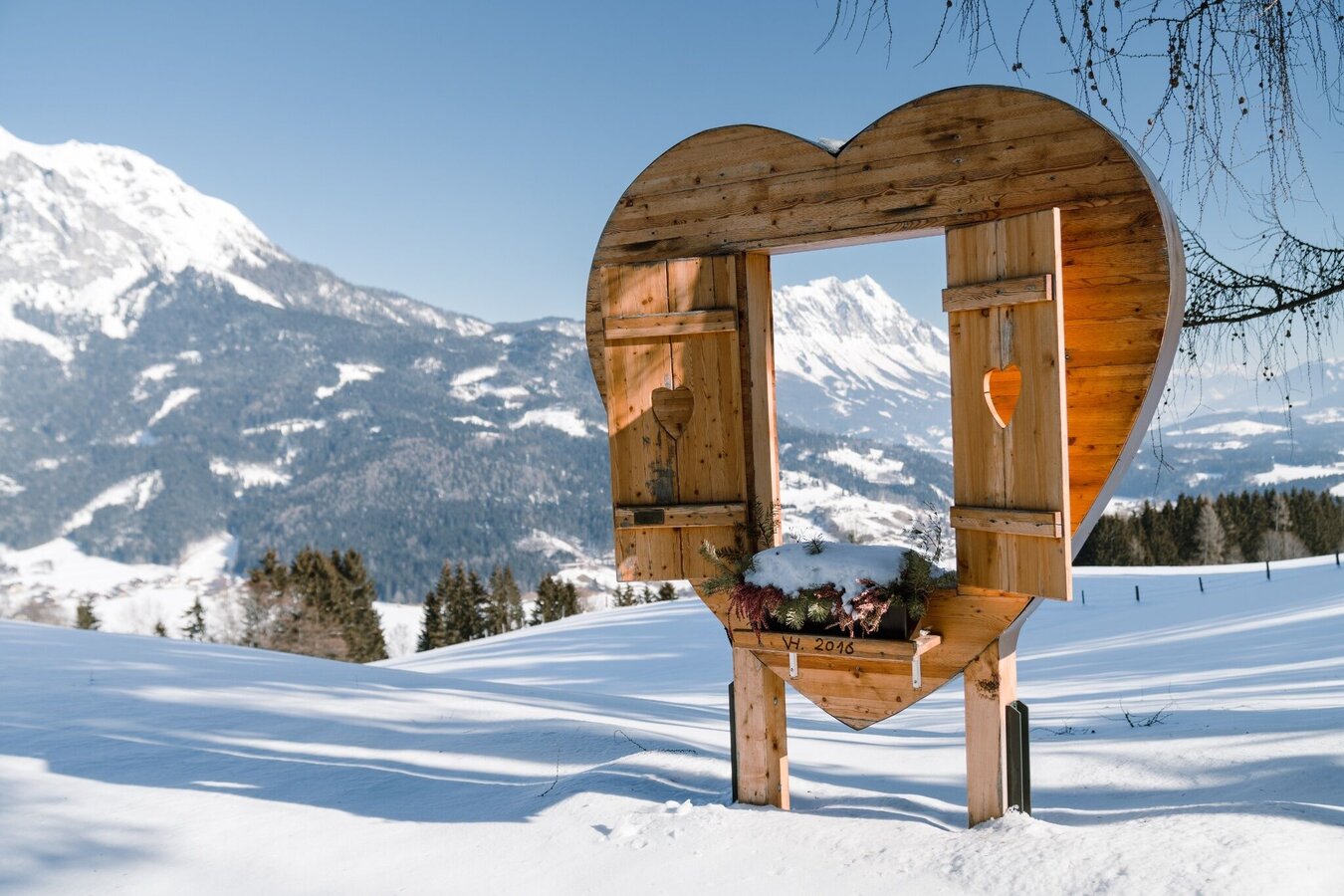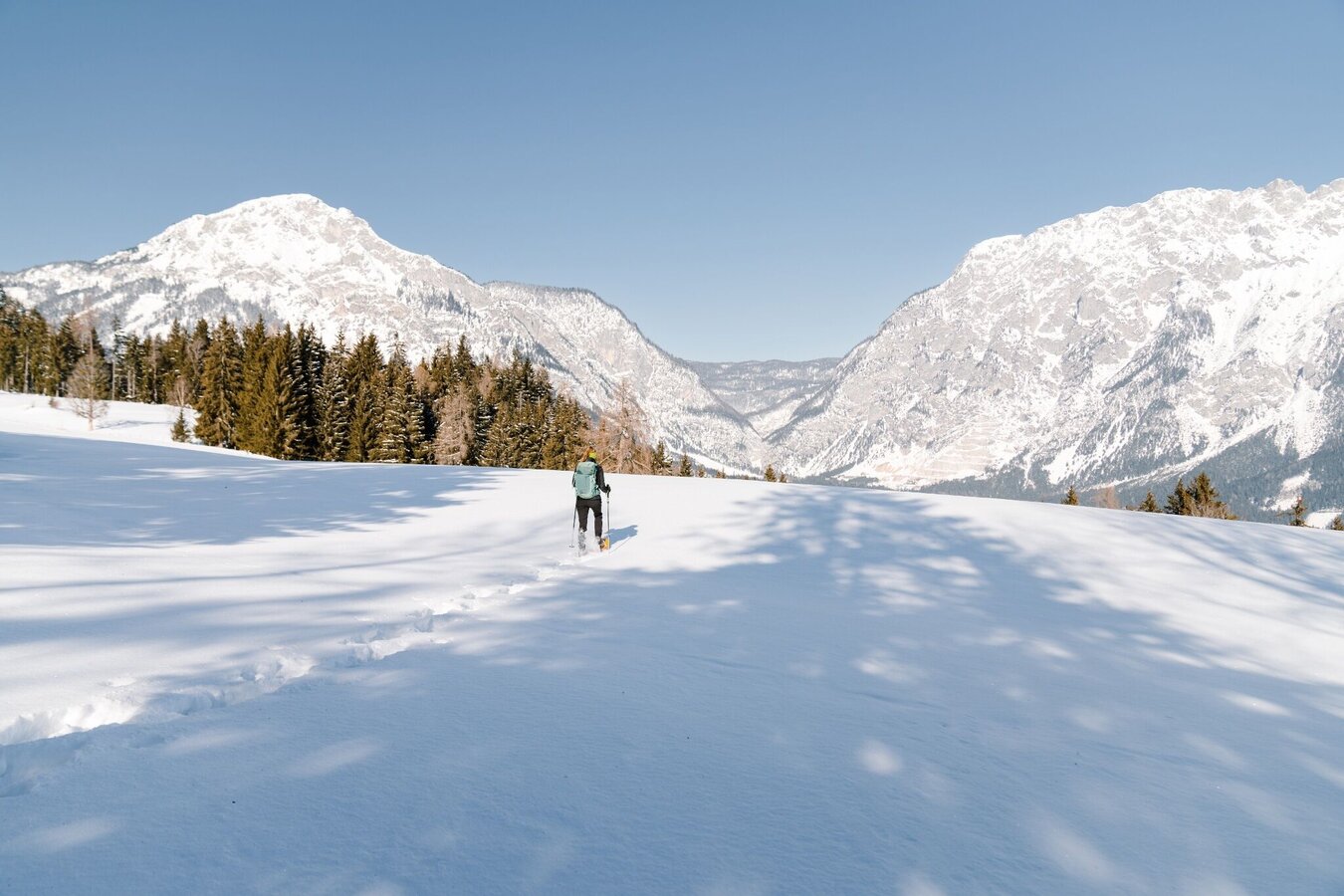 Outside the Ackerlhof, snowshoes take you right up the forest road through the snow-covered forest. It goes along the edge of the forest to a clearing. From here you have a breathtaking view of the surrounding mountains Stoderzinken, Kamm and Grimming. To the right is the Peace Bell. Then you cross the meadow to the Stöckelbergalm (not farmed). Follow the information boards until you reach the Snow Rose Hill. There it goes down again and back to the starting point.