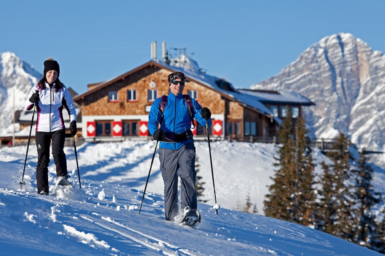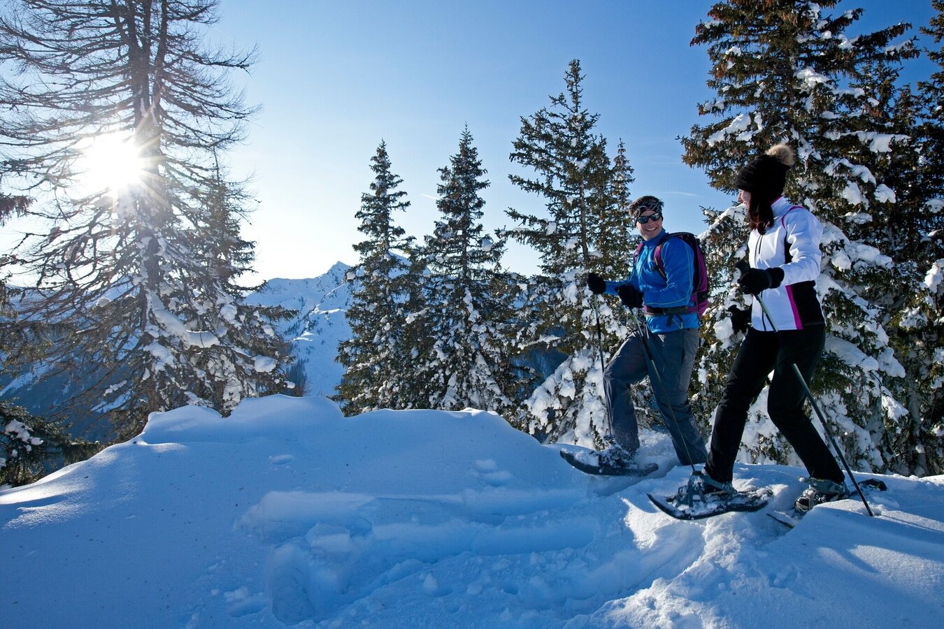 The initial part of the tour ist along an groomed winter walking trail. From Hüttecksattel mountain saddle you then walk through forest and over snow-covered alpine meadows up to Rossfeld. To the top of Hochwurzen you take Gipfelbahn Hochwurzen cable-car to the starting point at Hochwurzenhütte chalet, which is one of two refreshment stops besides Hochwurzenalm chalet. The winter scenery on Hochwurzen and the summit of Rossfeld is breathtaking!