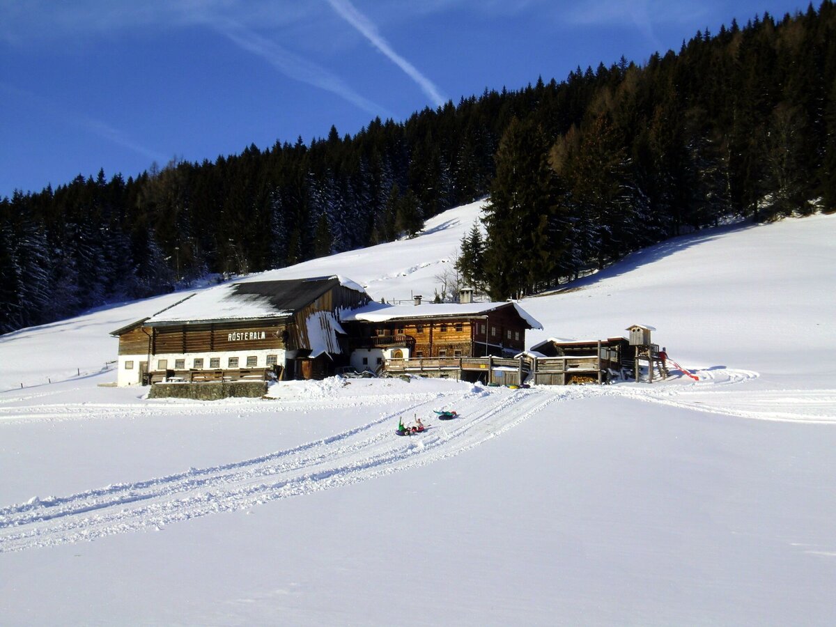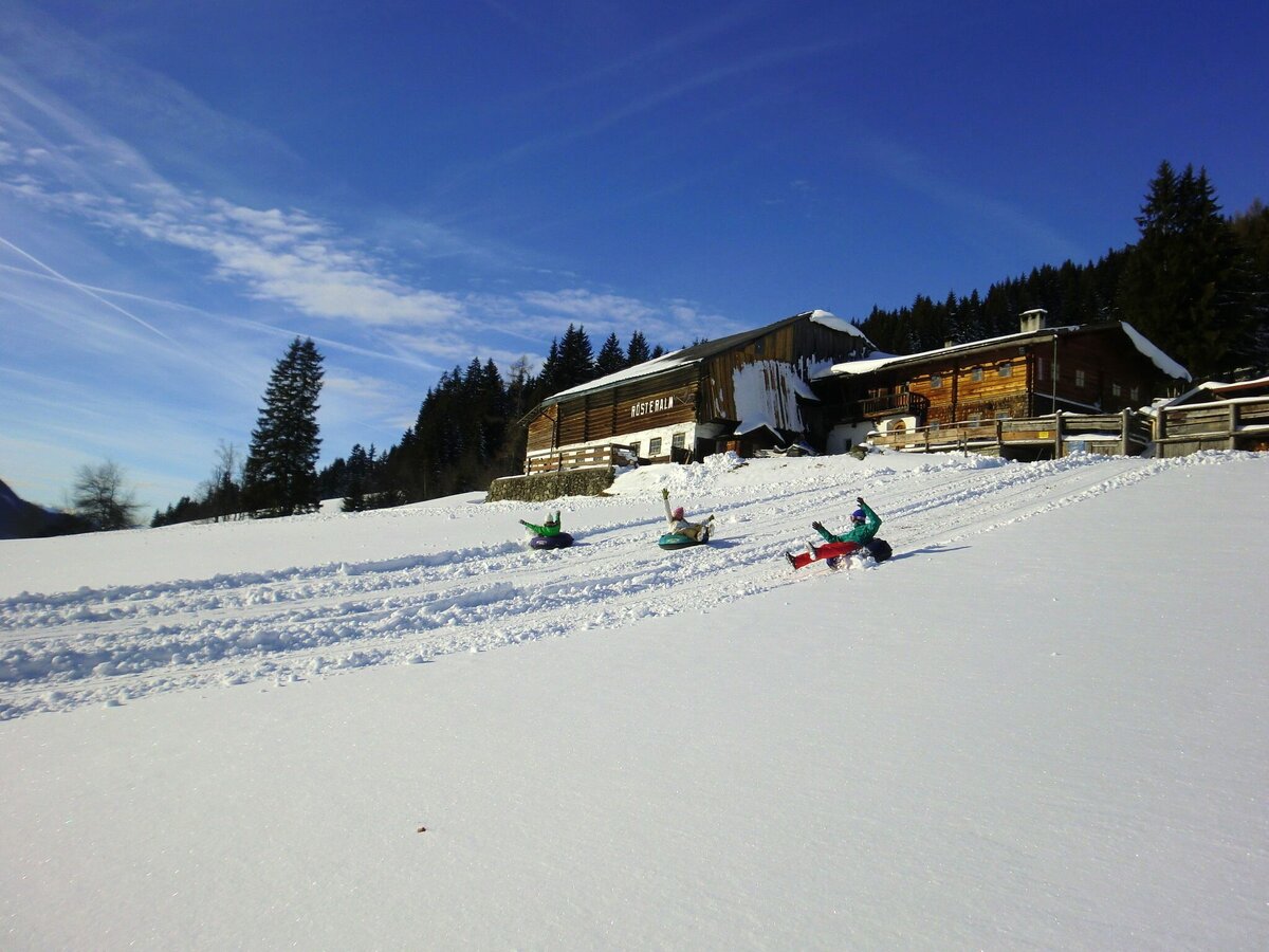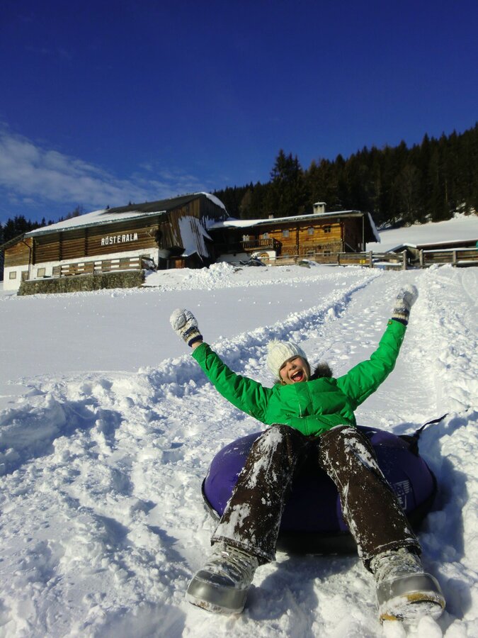 From the Stoanerhof you walk up the forest road to the Rösteralm inn, which you reach in about 35 to 40 minutes. The 3 snowtubing lanes are next to the Rösteralm inn. For the way back to Stoanerhof you can rent a toboggan at Rösteralm.