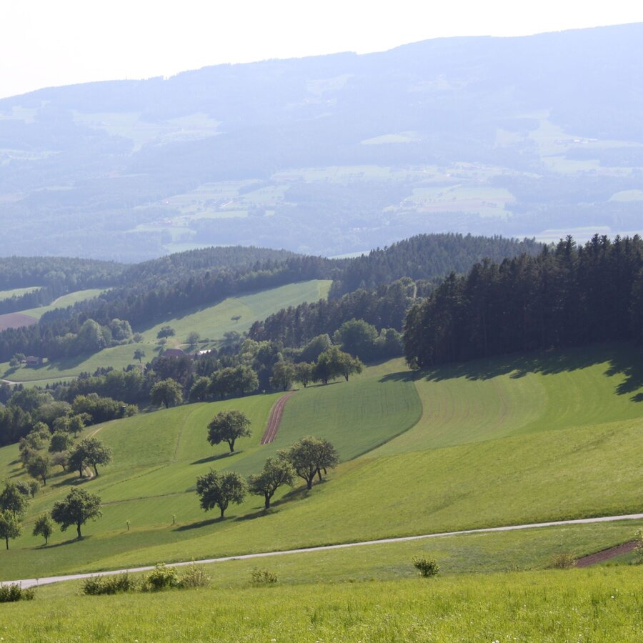 • We continue to follow the forest nature trail and walk slightly downhill along the access road until the path leads us left into the forest. We continue slightly downhill along the high trail and reach the "Panoramablick Pöllauberg" viewpoint with the last stop on the forest nature trail.