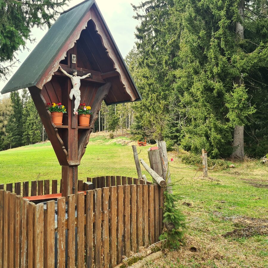 • Once at the Lüßwaldsattel, we follow trail no. 941 in the direction of Pöllau and the "Waldlehrpfad" sign. The well-maintained forest path, which is also marked with blue and yellow dots, takes us to the Dorfhanslkapelle chapel, just behind the signpost, in about 15 minutes.
