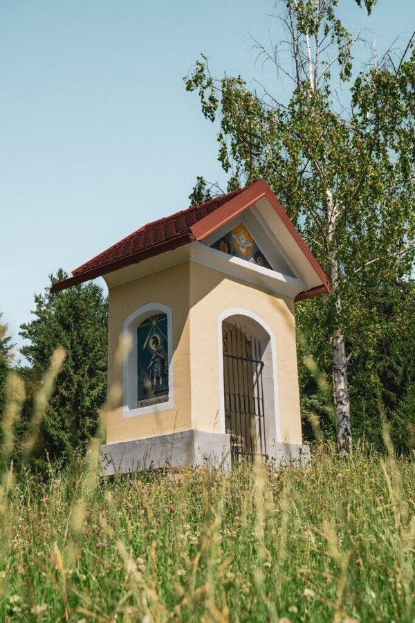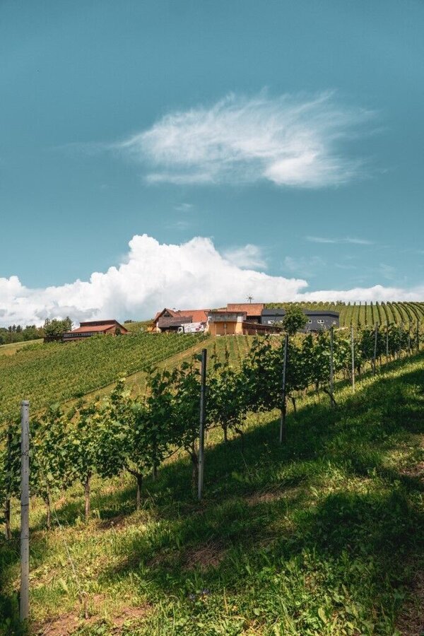Links am Weingarten vorbei, mit Blick auf Eibiswald und den Radlkamm, über den Höllberg, auf Wiesen- und Waldwegen durchwandern Sie dann den Weingarten Müller, bis Sie bei einem schönen Bauernhaus mit Kapelle ankommen, wo der Sommer im Weingartenjahr beschrieben wird.