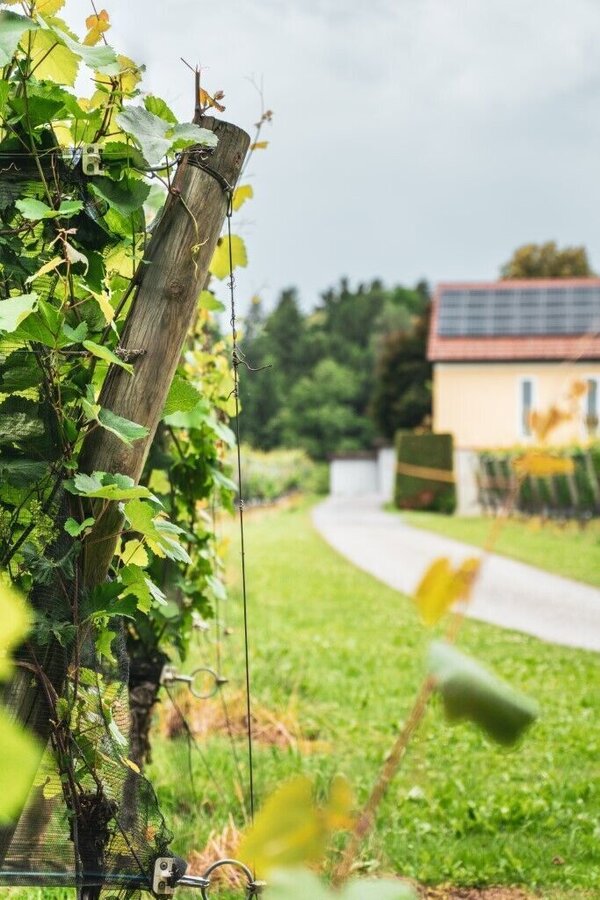 Herbst, Weingut Peiserhof:Die Blätter im Weingarten werden bunt, die Trauben reif, weich und saftig, der Klapotetz dreht sich im Wind und vertreibt die Stare. Nun wählt der Weinbauer den idealen Zeitpunkt zur Weinlese.