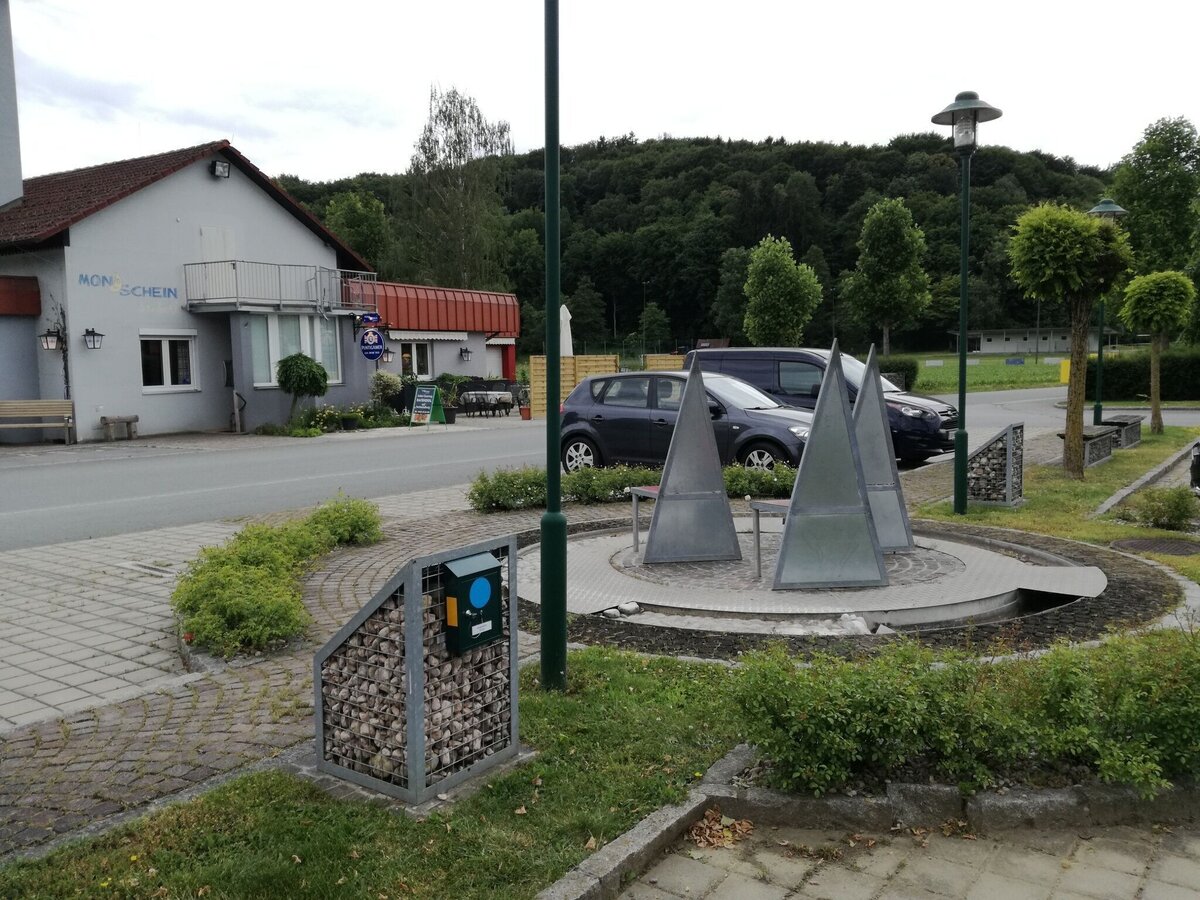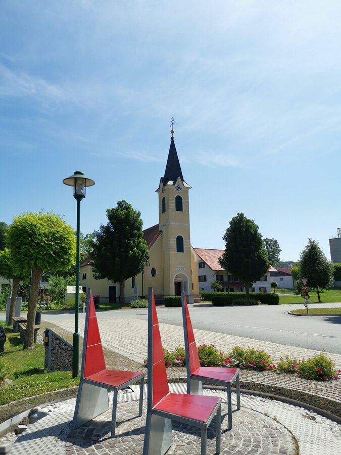 Wörth direction south to the end of the village, to the left, Suppan fish pond, through the district of Baumgarten, at the wayside shrine straight ahead for about 300 m, left ascending through a forest. At a seating area you will see the Lichtenegg Chapel. Right further on the high trail to the "element metal" - the gong at the Brandlegg" - panoramic view as well as beautiful sunrise or sunset to observe. Beautiful view to the Riegersburg, left short piece of country road direction Toter Mann - Lichtenegg, along the high trail left to BSHirschmann, Bastelstube Weiß, sports facility, MondscheinStüberl, village square Wörth, element "fire.