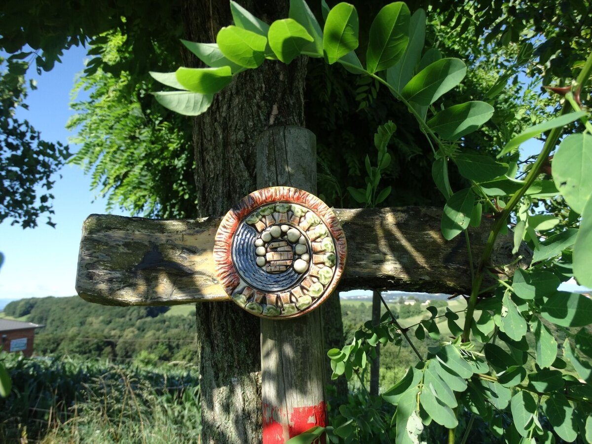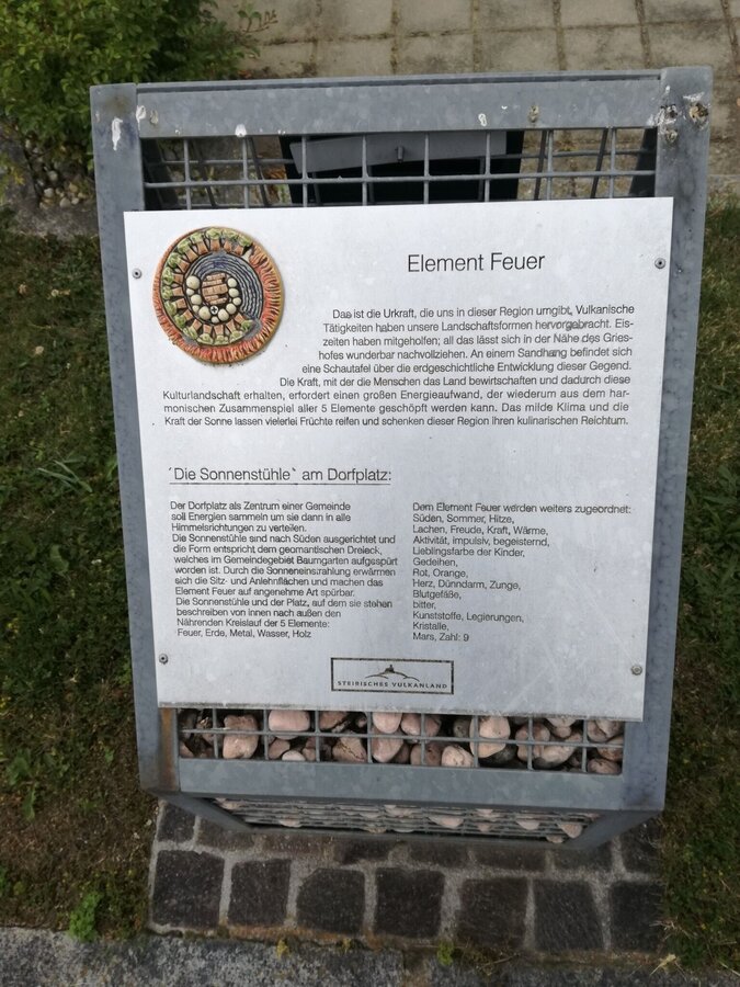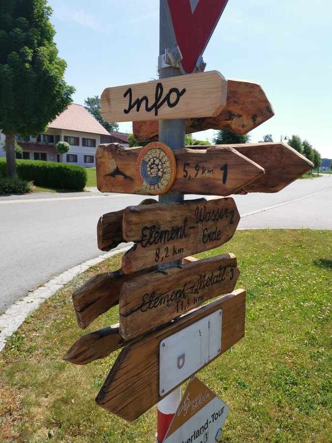 Wörth direction south to the end of the village, to the left, Suppan fish pond, through the district of Baumgarten, at the wayside shrine straight ahead for about 300 m, left ascending through a forest. At a seating area you will see the Lichtenegg Chapel. Right further on the high trail to the "element metal" - the gong at the Brandlegg" - panoramic view as well as beautiful sunrise or sunset to observe. Beautiful view to the Riegersburg, left short piece of country road direction Toter Mann - Lichtenegg, along the high trail left to BSHirschmann, Bastelstube Weiß, sports facility, MondscheinStüberl, village square Wörth, element "fire.