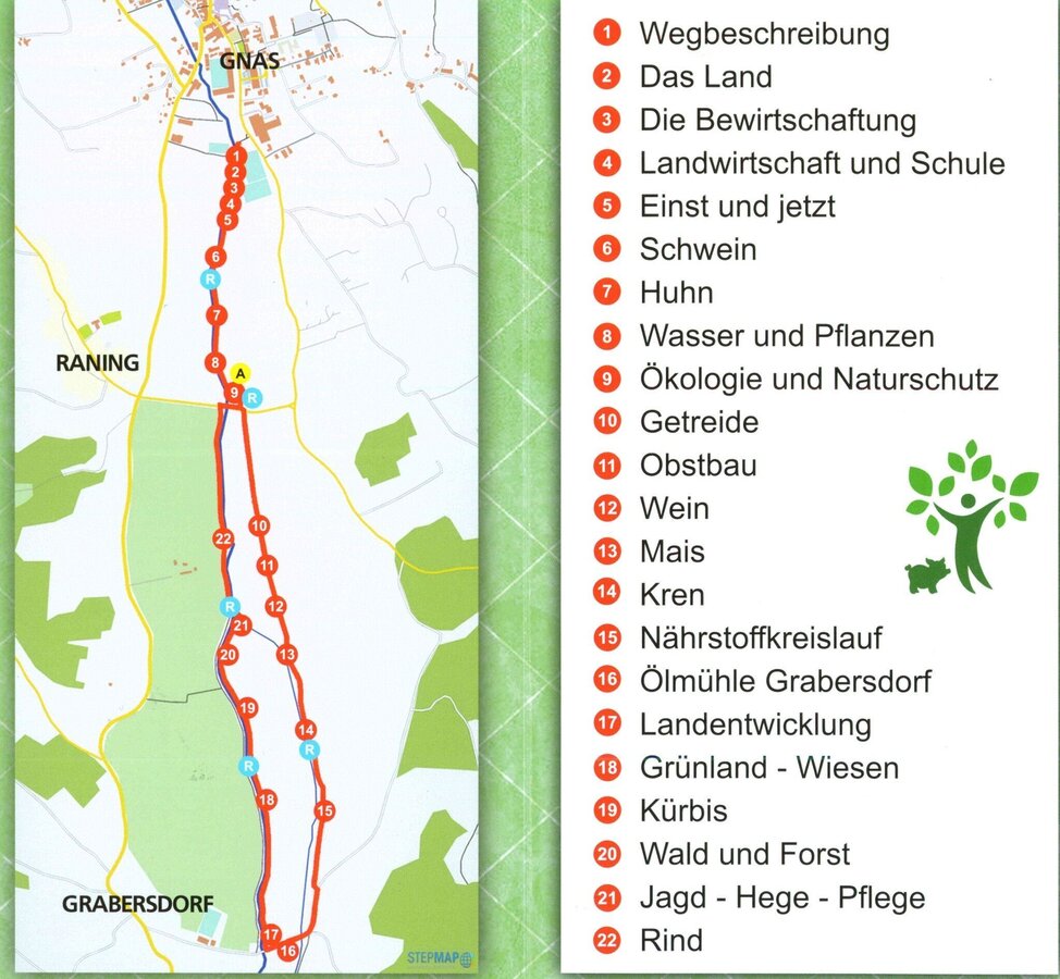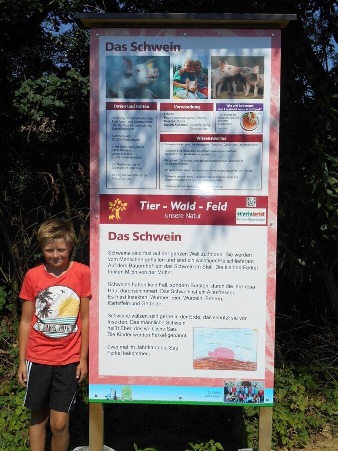 Along the way, 22 information boards describe various agricultural topics. The boards are divided into two halves, so that the upper half for adults deals with the respective topic and the lower half for children is simple and informative.