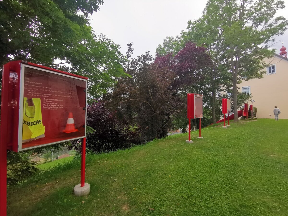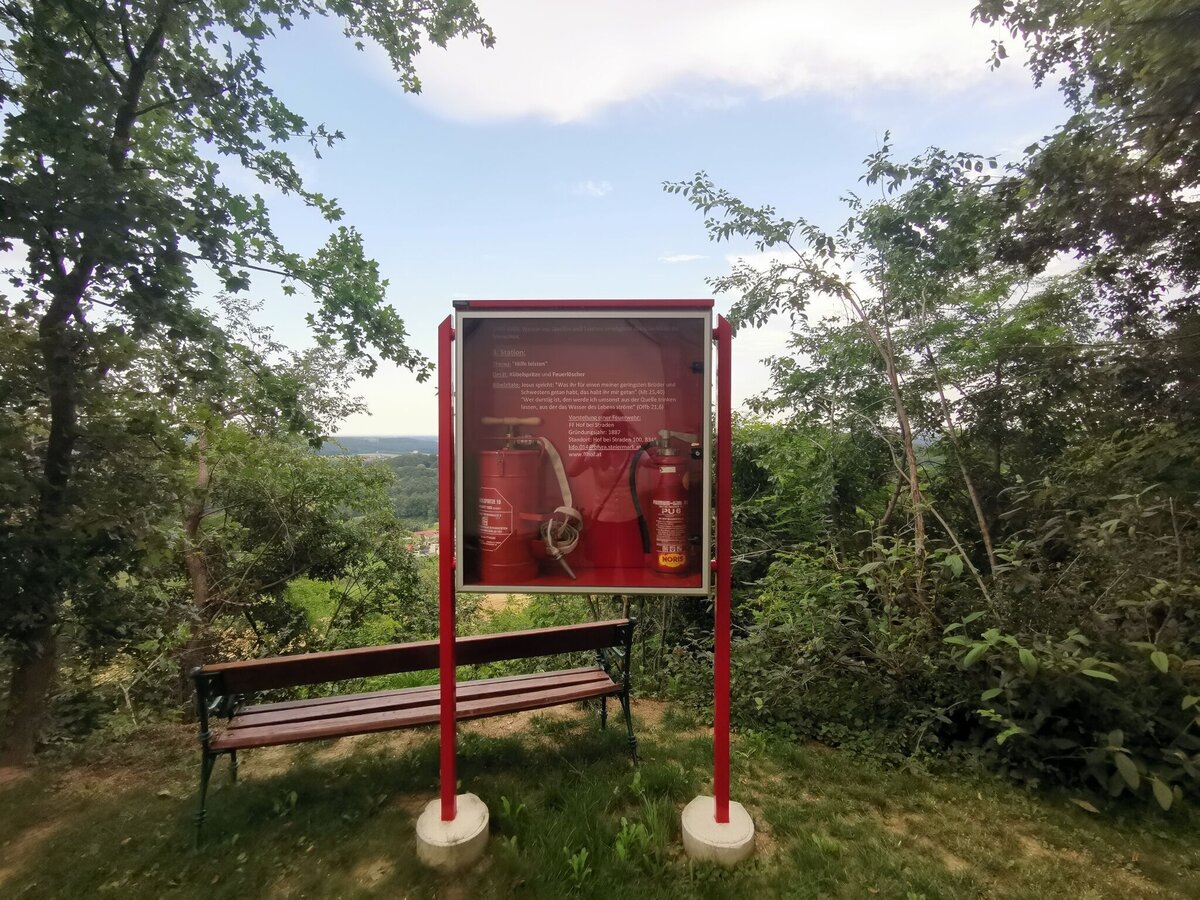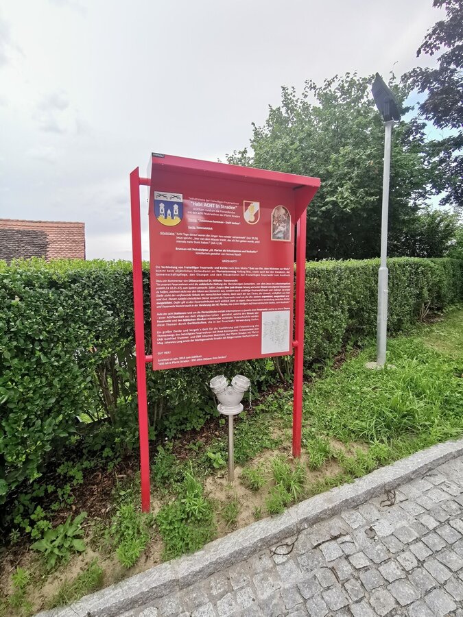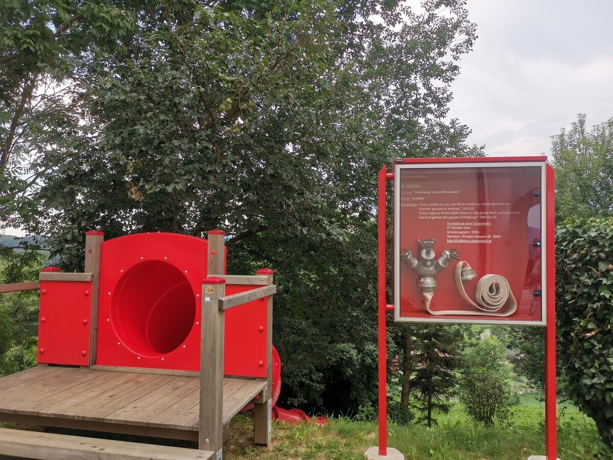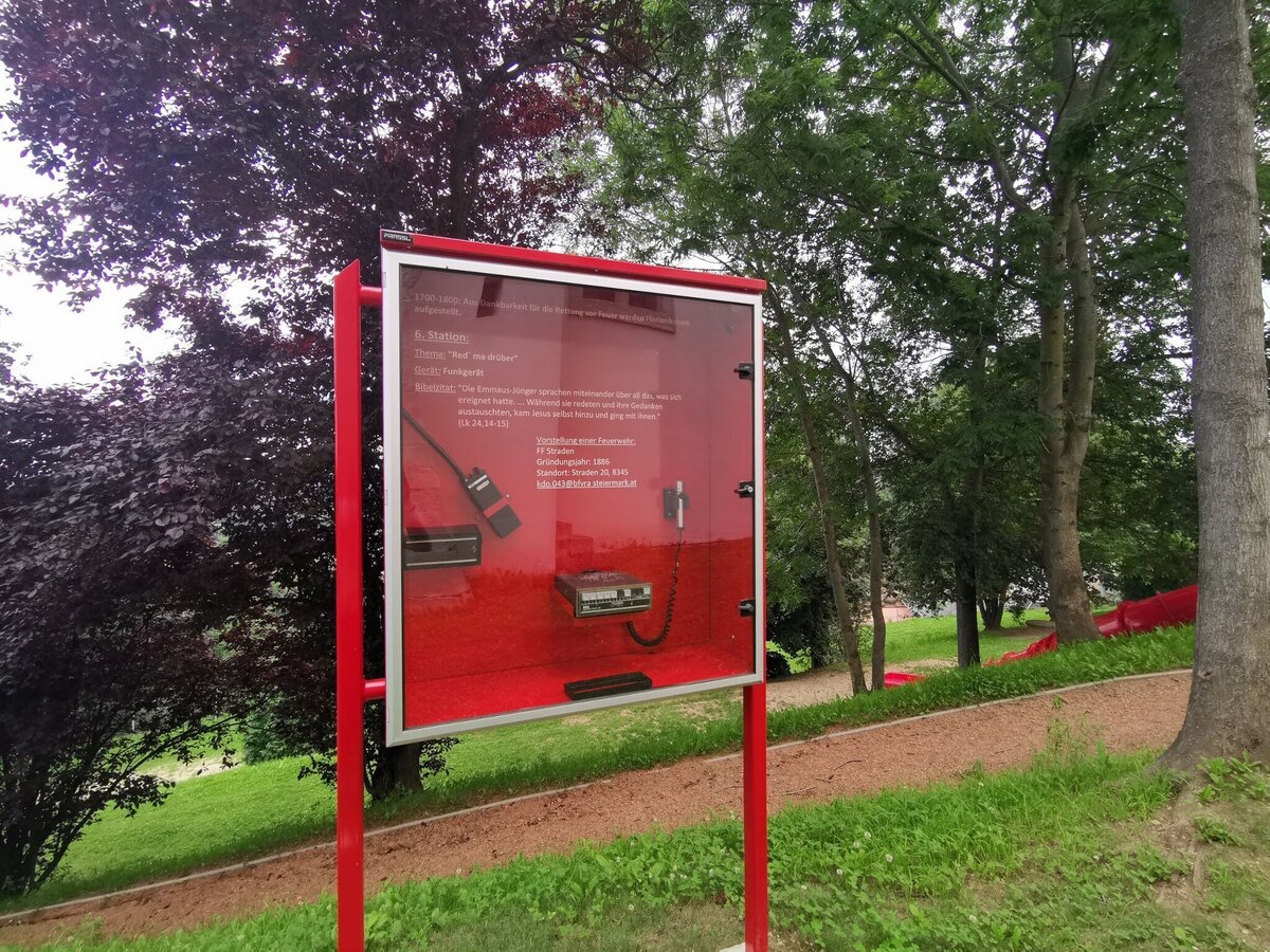 The theme trail of the Straden parish volunteer fire department takes us around the Floriani church. The tour starts at the fountain with the stone sculpture “St. Florian as patron saint and emergency helper”. Past the rest area and the fire engine red playground, the path leads us to the stations: