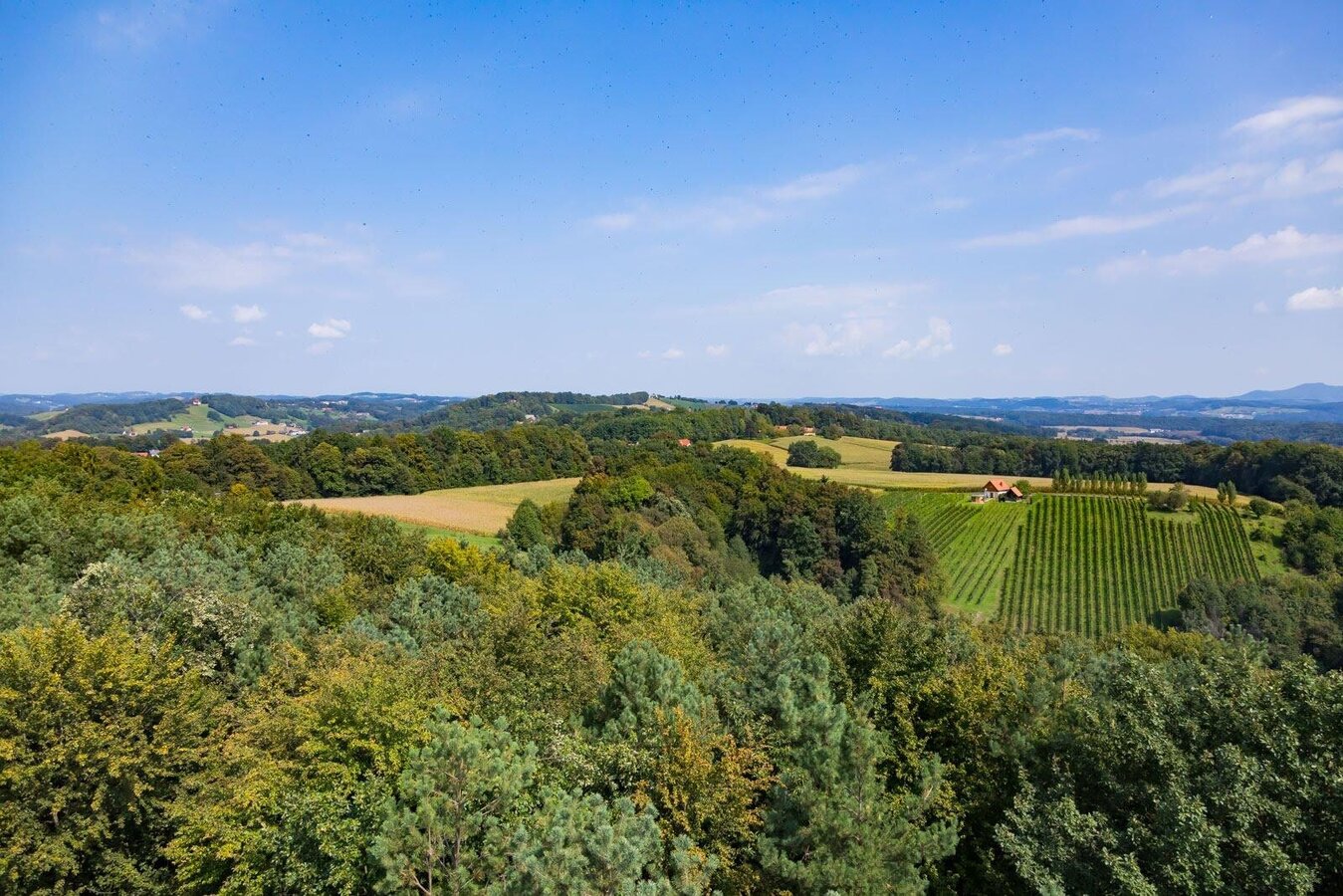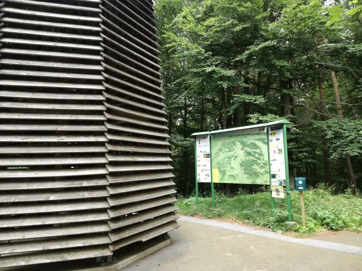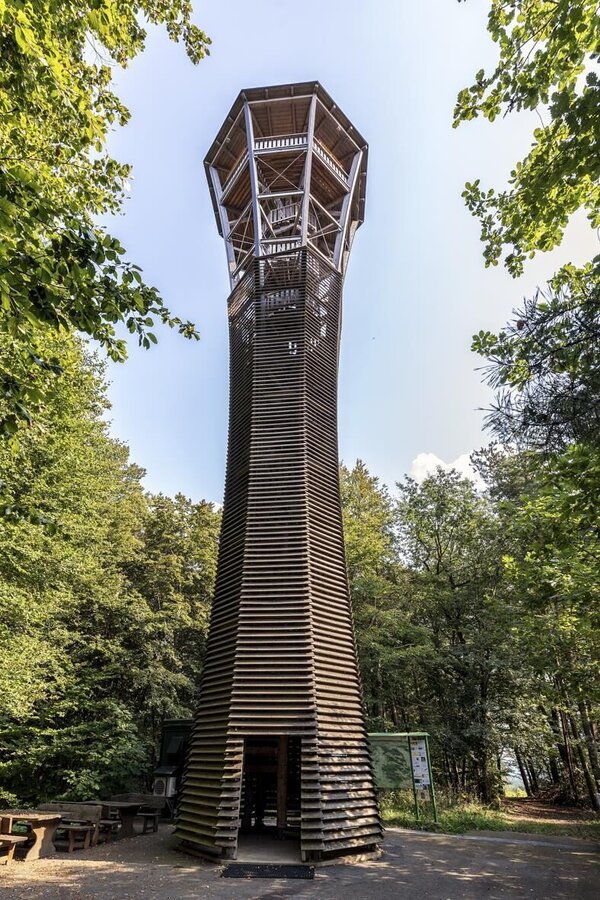 We now leave a small rest area and hike with wonderful views past Kellerstöckel, through vineyards until we finally reach Perbersdorf. Now we hike to the Perbersdorfberg and Entschendorfberg. Our hike leads us through mixed forests, which are partly overgrown and resemble a jungle. Last but not least, after the second, longer forest section, we climb another dead end and hike between the vineyards. In a wide left turn, we now reach the wooden wine observatory with a perfect panoramic view over southeastern Styria all the way to the Gleinalm and the Hungarian lowlands.