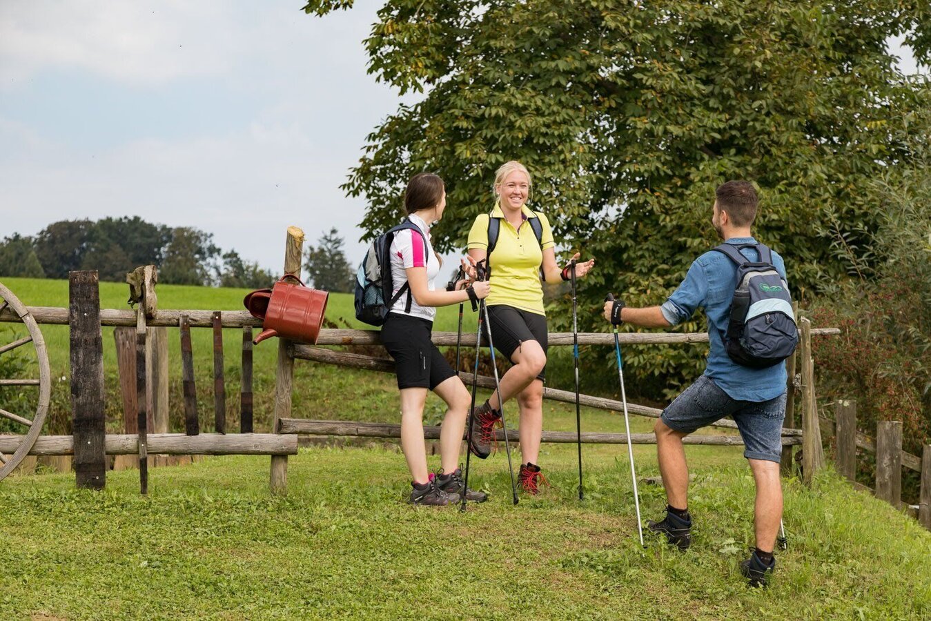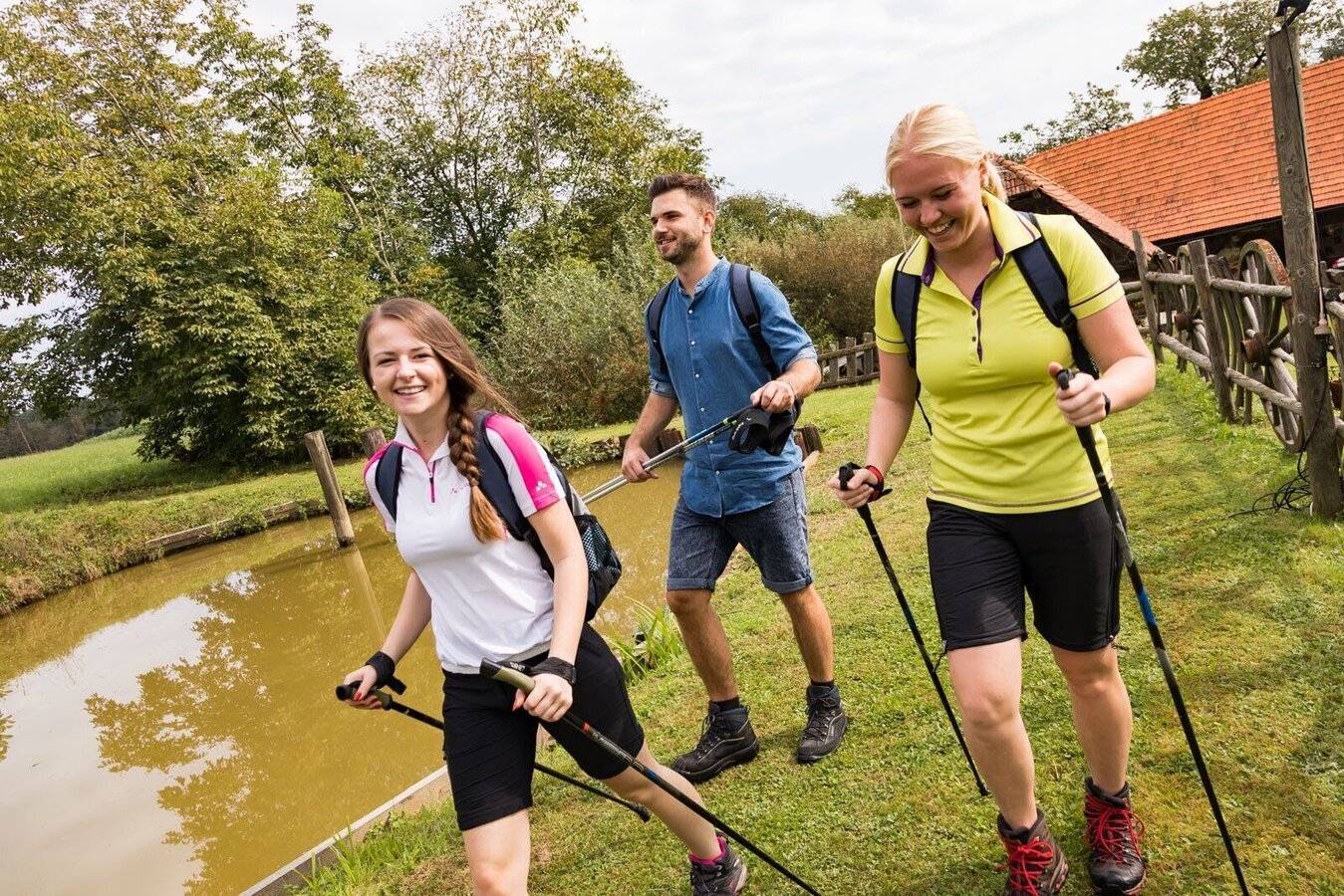 We now hike back a short distance on the Kammweg and then branch off to the right, where we pass a fish pond and reach the Oberrosenberg. At the lower end of our hike along the panoramic plateau we come across the Grabenland Trail "Wanderstock", which we follow briefly in order to turn right on a steep road through the forest, and then past the adventure pool to Mettersdorf.